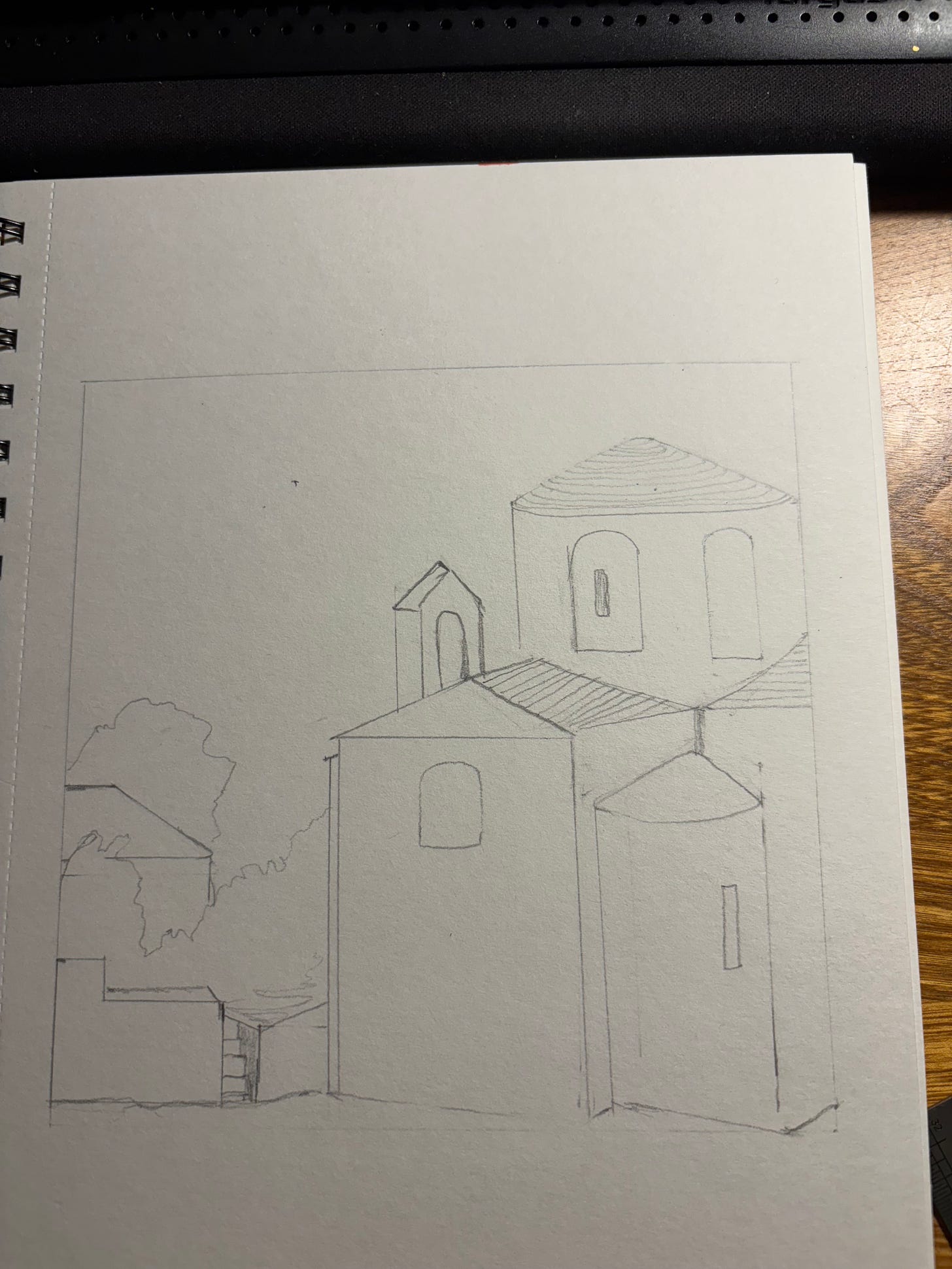 Yesterday I saw a friend who is a wonderful photographer, and she showed me her photos of a late summer trip to Croatia. She sent me a couple that I particularly liked, and below is my sketchy first attempt at drawing one of them. To be continued. Intense blue sky, white buildings, red tiles roofs. Gonna take a while. Much shadowing to be done. Right now it’s pretty flat.