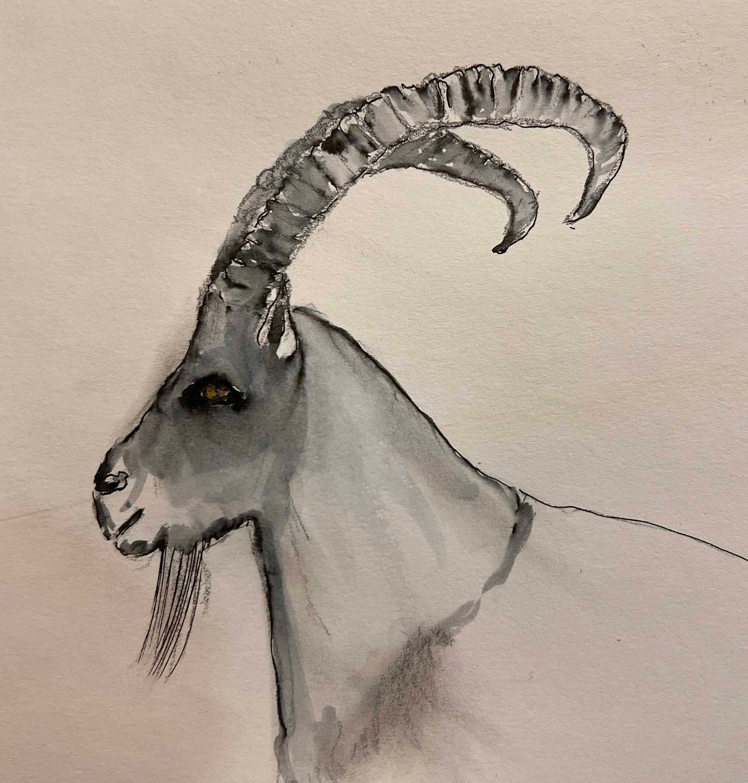 The trekking guide (a friend of an Italian friend, actually, the Italian mountain guide friend was someone we met up with in Greece not so long ago) included a couple of great photos of Alpine Ibexes (not sure that’s the correct plural), which inspired this evening’s quick pen and ink. He told a lovely story about keeping a very young hiker entertained by spinning stories of how the ibex paint the regional rocks with paint stored in their magnificent horns. Apparently, they never shed their horns (unlike elk or deer), so you can estimate the animal’s age by the number of ‘rings’ or segments in the horns.