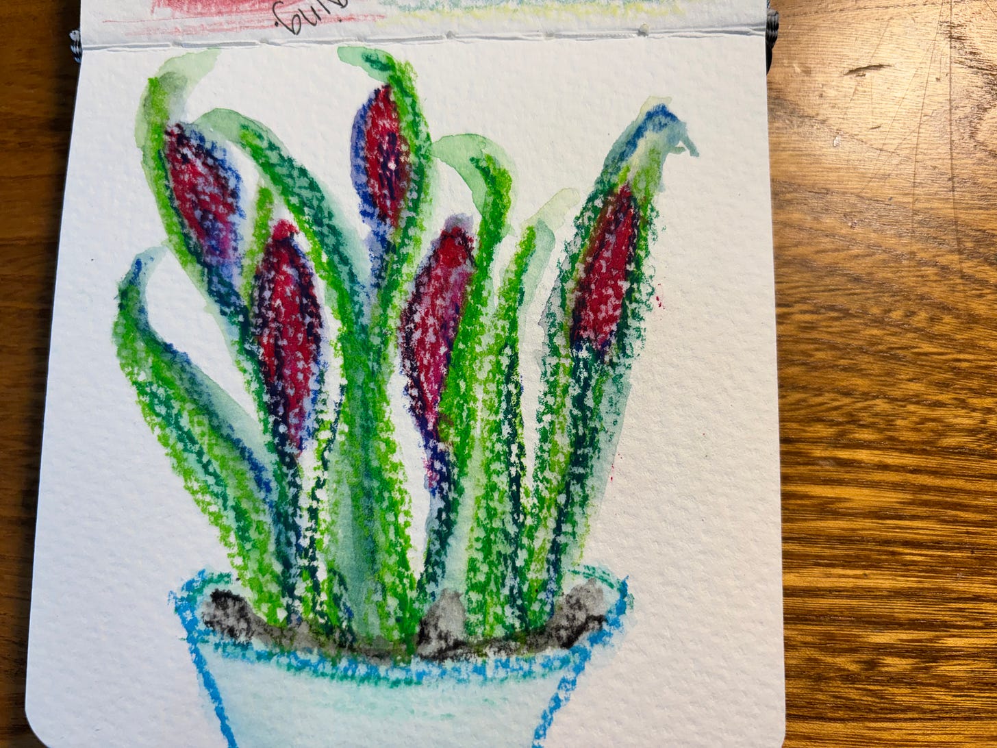 To celebrate, I bought myself some red tulips which I am going to draw using a different medium every day until they expire. Today I used water-soluble oil pastels and tried not to be fussy.