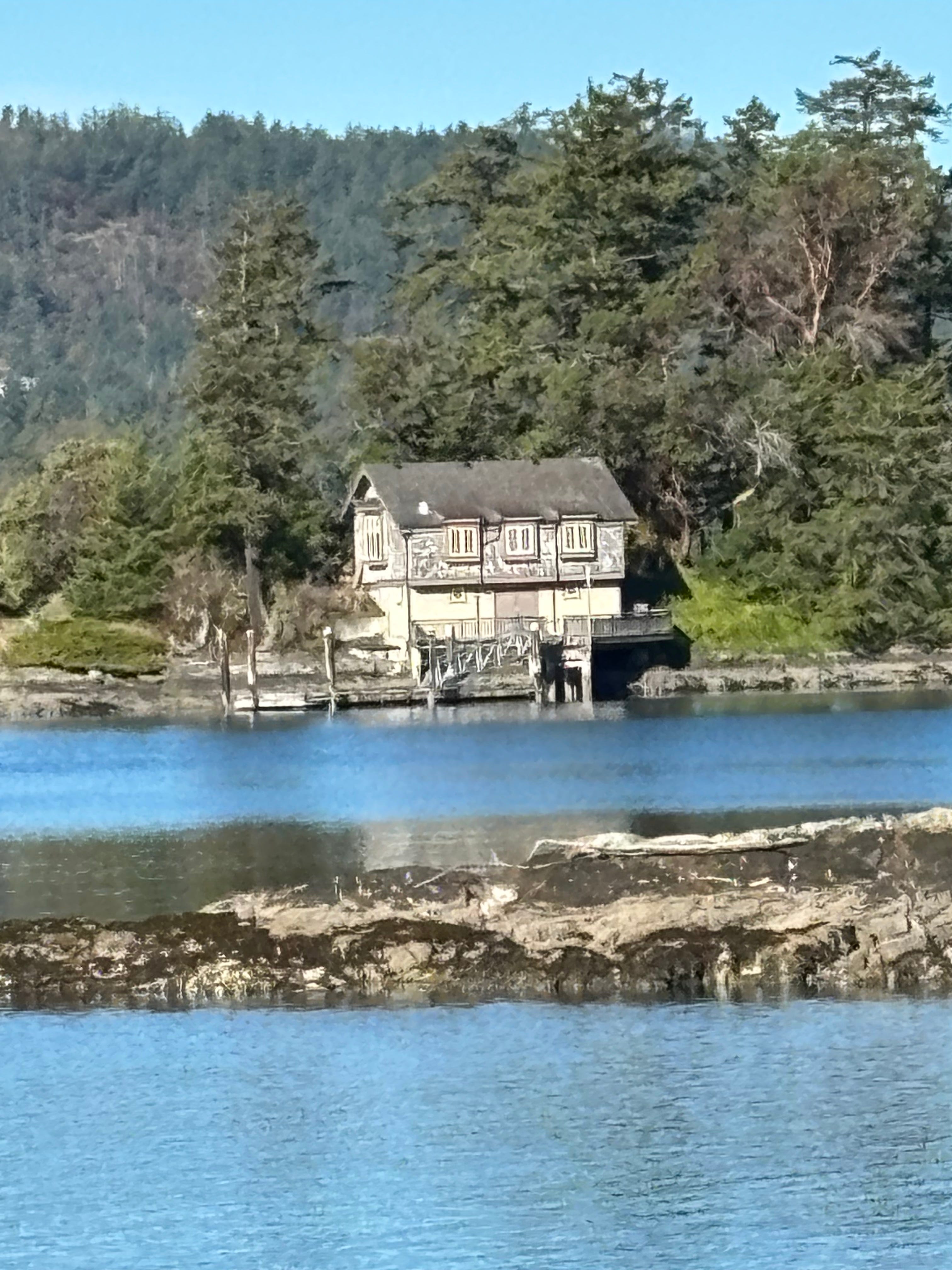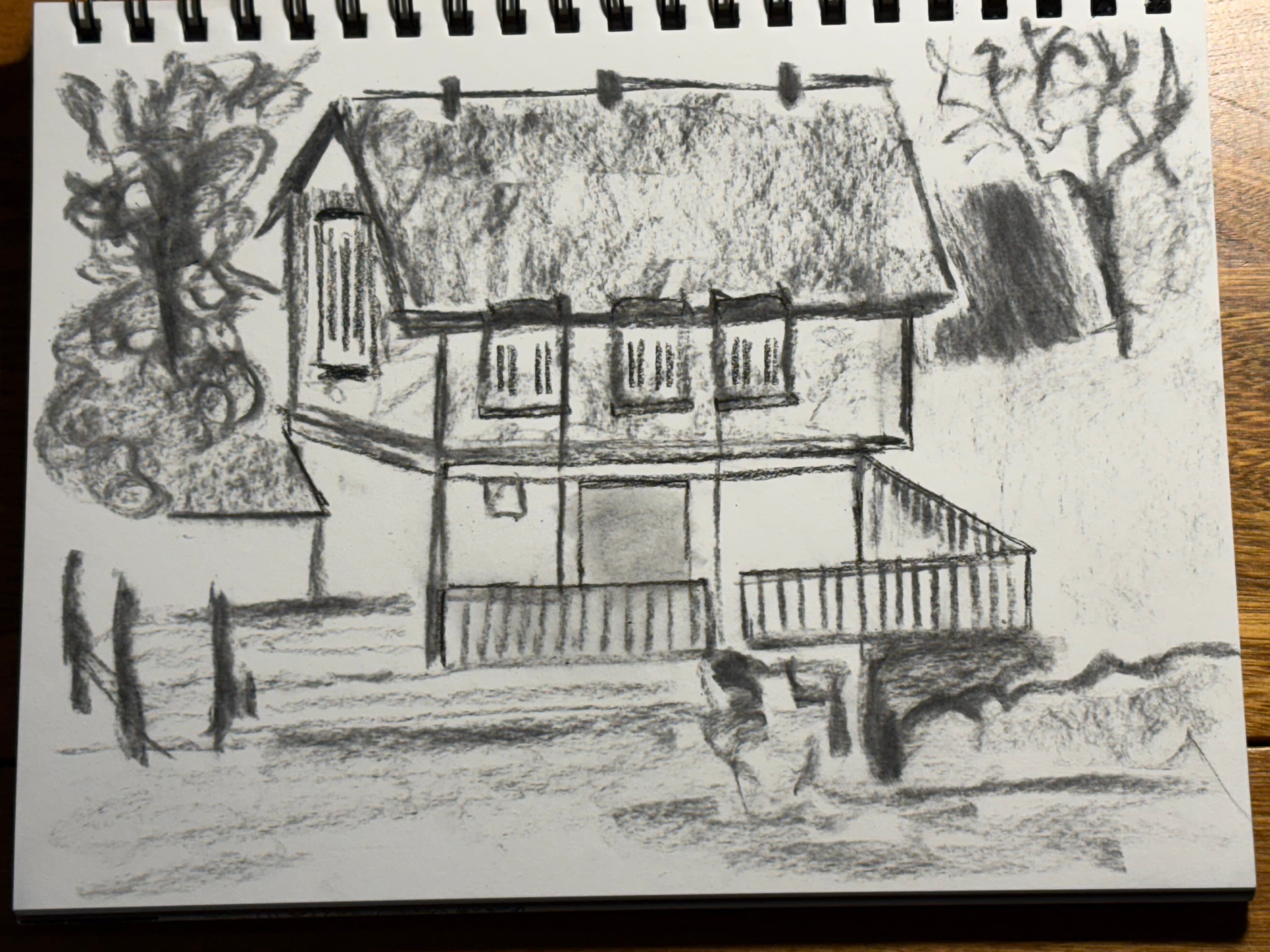 I took a photo of a strange old house on Portage Inlet—too far away to tell if it was derelict, but I think it is. The location is gorgeous, but the house is definitely falling apart. I wonder what the story is. I haven’t used charcoal for a while, but I thought it would convey the ramshackleness of it all.