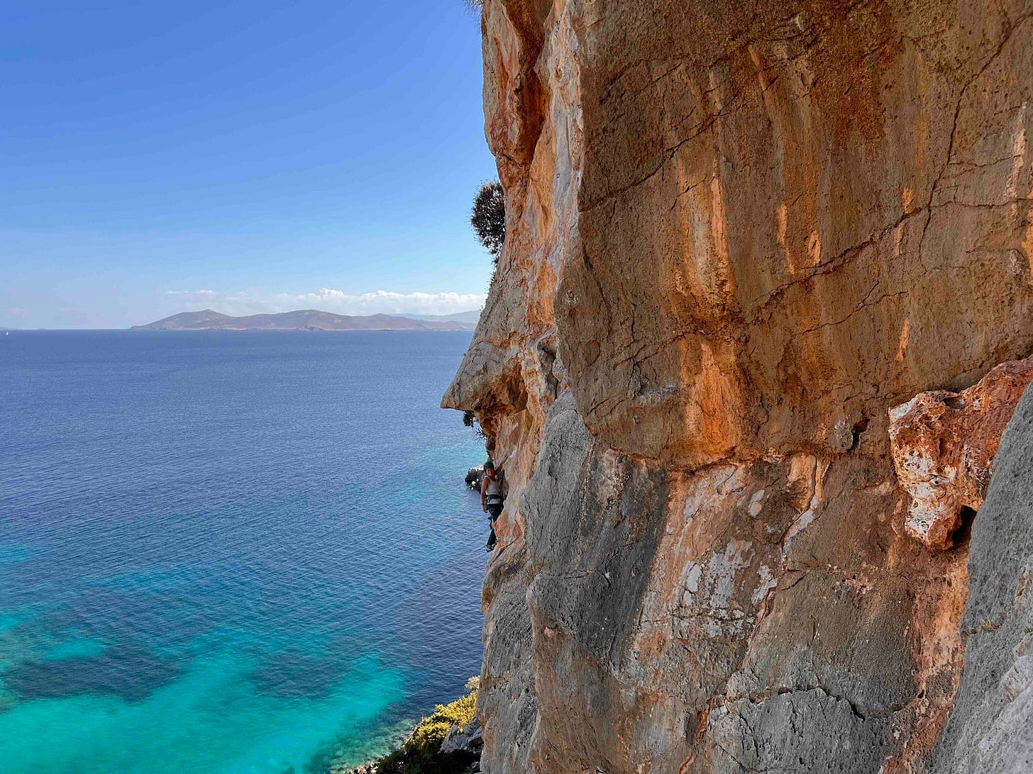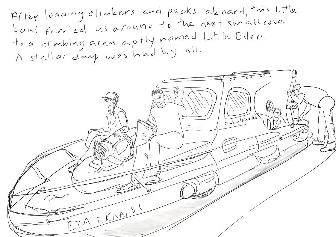 We gathered relatively early this morning, drove to the other side of the island, and found a boat willing to take us around the corner to a rather appropriately named cove known as Little Eden. Back in the day it seems to have been known as a picnic/swim spot, but being flanked by cliffs, it was inevitable the climbers (and sailors) would find it attractive.