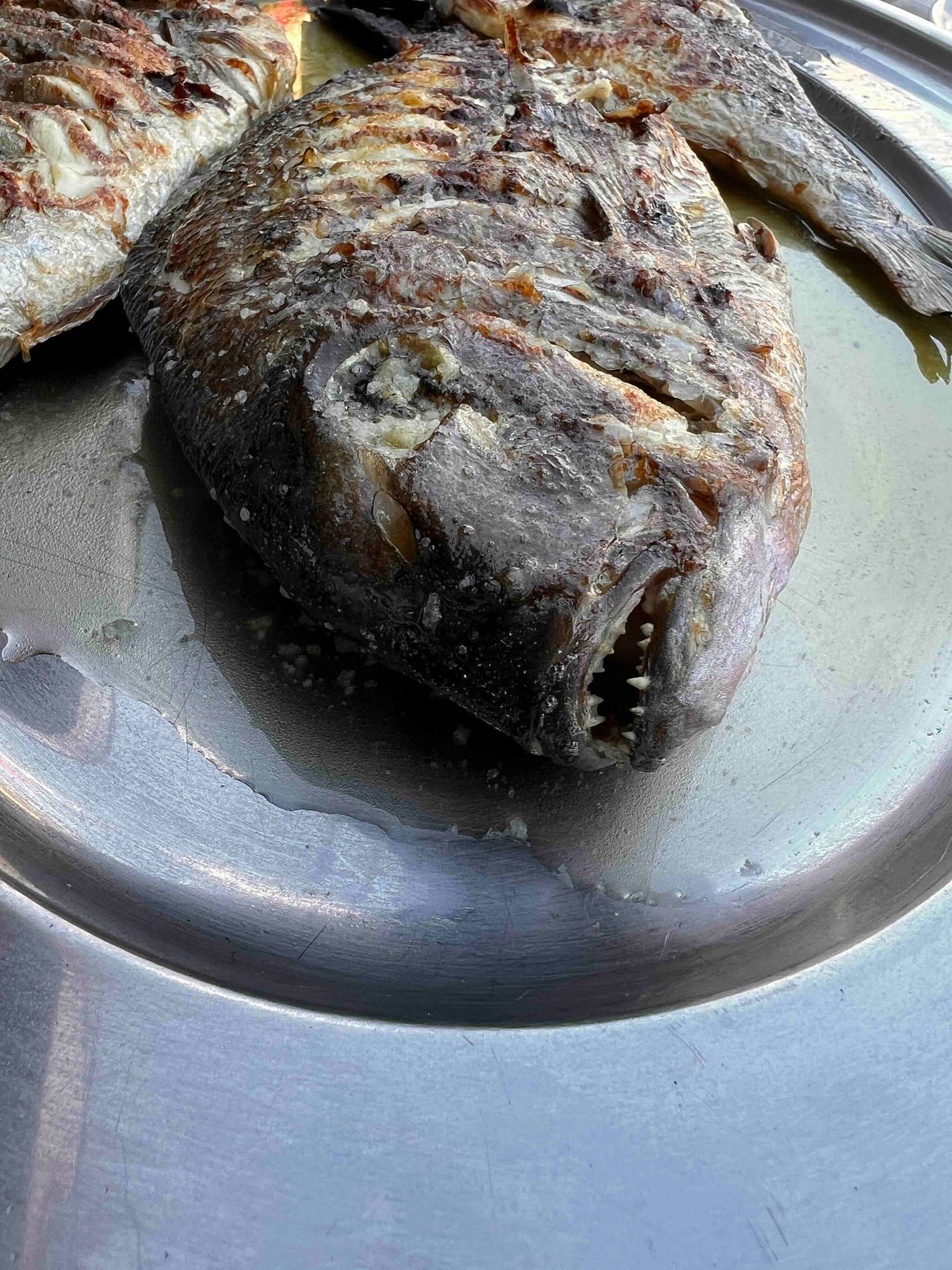 What a fabulous day. We climbed. We swam. We feasted (the boat ride is free, but the owner of the boat also happens to own a restaurant where, it was strongly suggested, we come to eat after our day at the crag). The meal was fantastic, though maybe not so attractive from this angle: