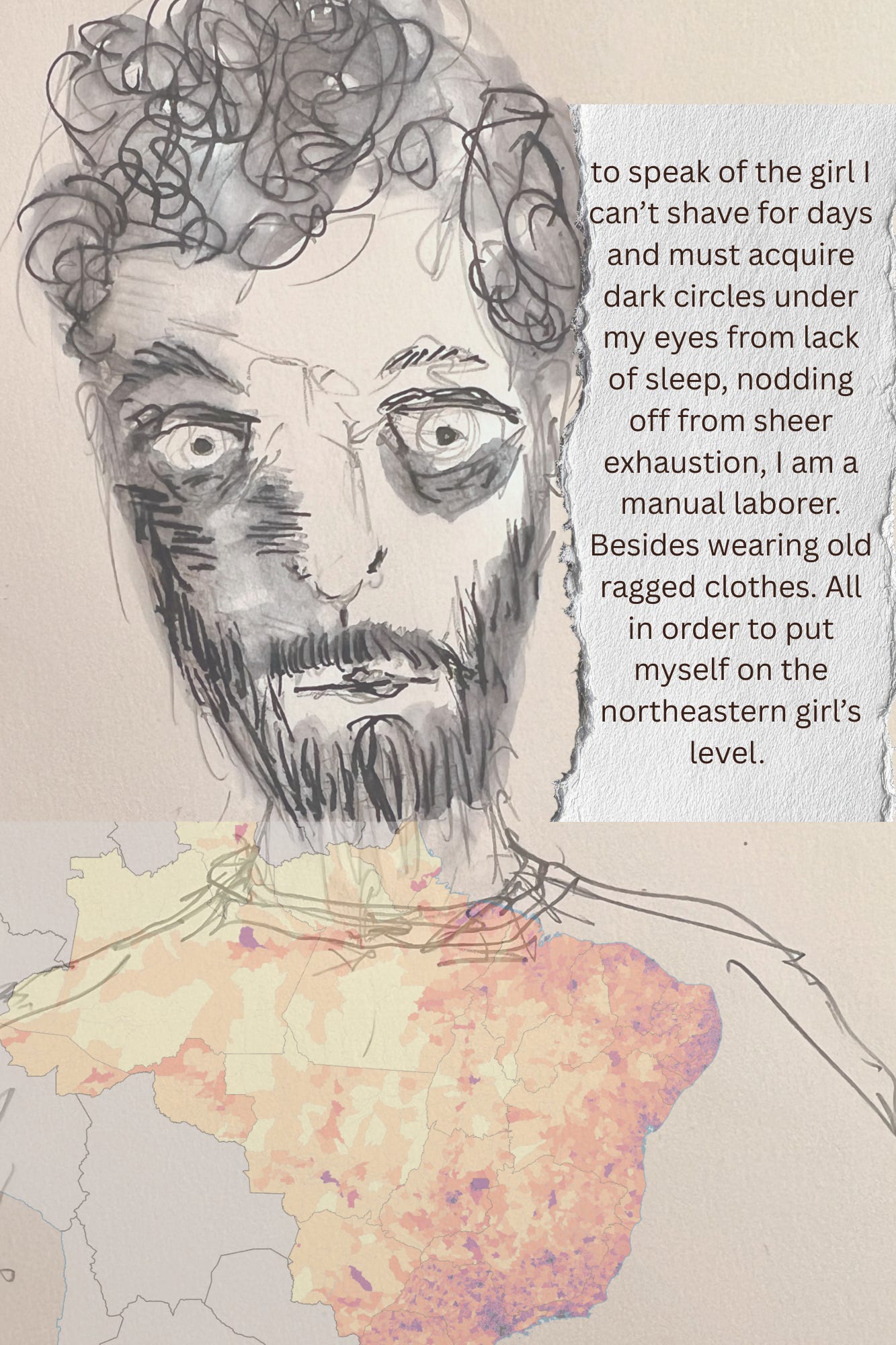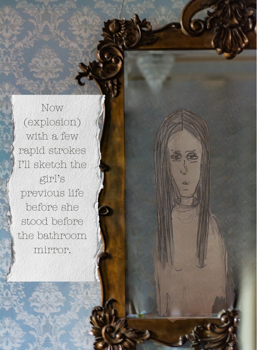 These two pieces are going into our class presentation tomorrow night - both are inspired by Clarice Lispector’s novel, The Hour of the Star. Lispector deliberately used unconventional punctuation and syntax (not always for obvious - to me, at least - reasons). The first image is of the narrator of the novel (a meta work in which he constantly reminds us that he has full/no control over the story) and the object of his affection/obsession (the girl in the mirror). These are both mixed media with a digital element.