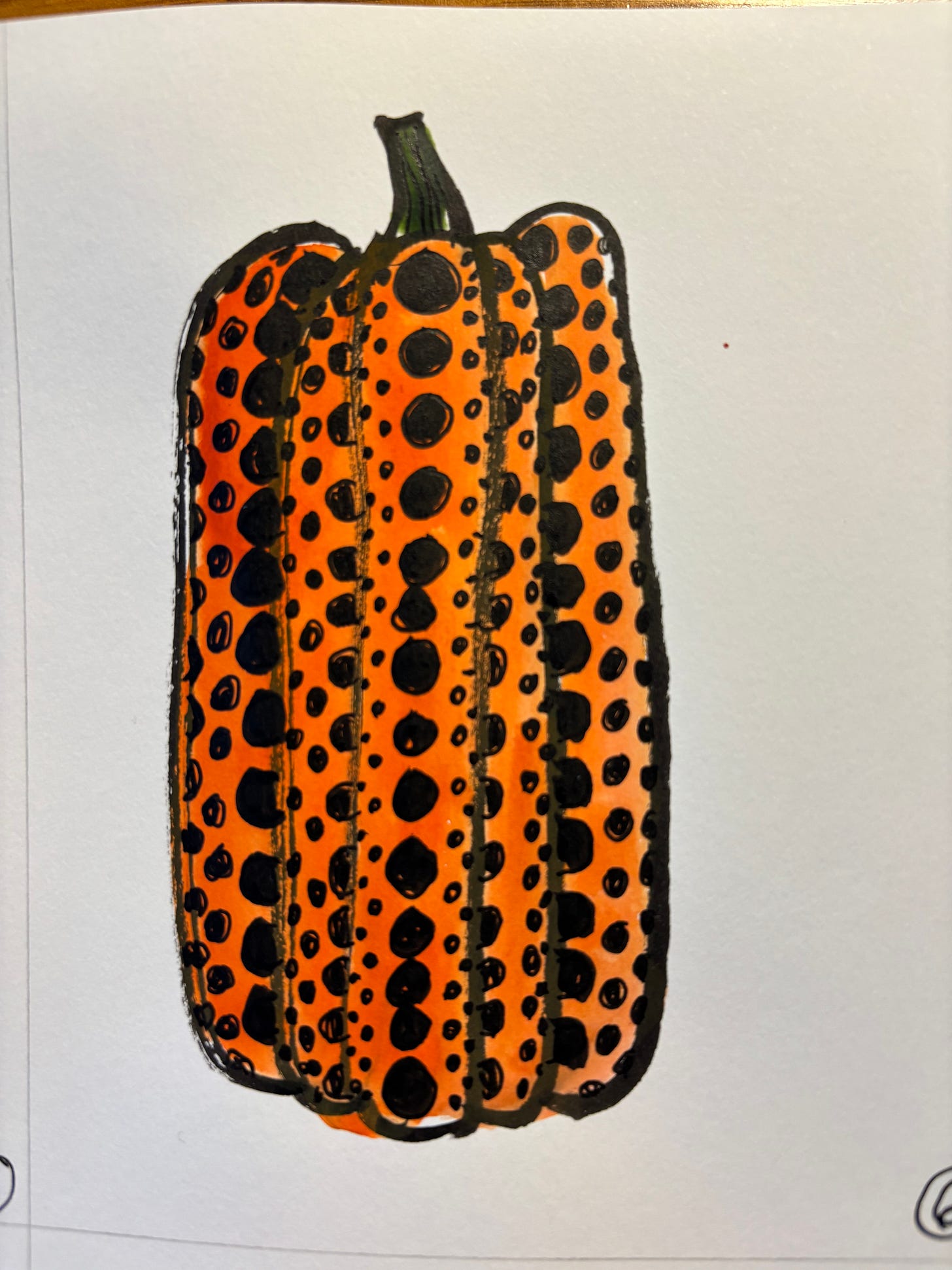 So glad your back is better, and that your day was lovely. Mine was … uneventful. No swimming for me either. lol. Here is one of the eight drawings I did yesterday. I call it “Halloween, but make it Kusama.”