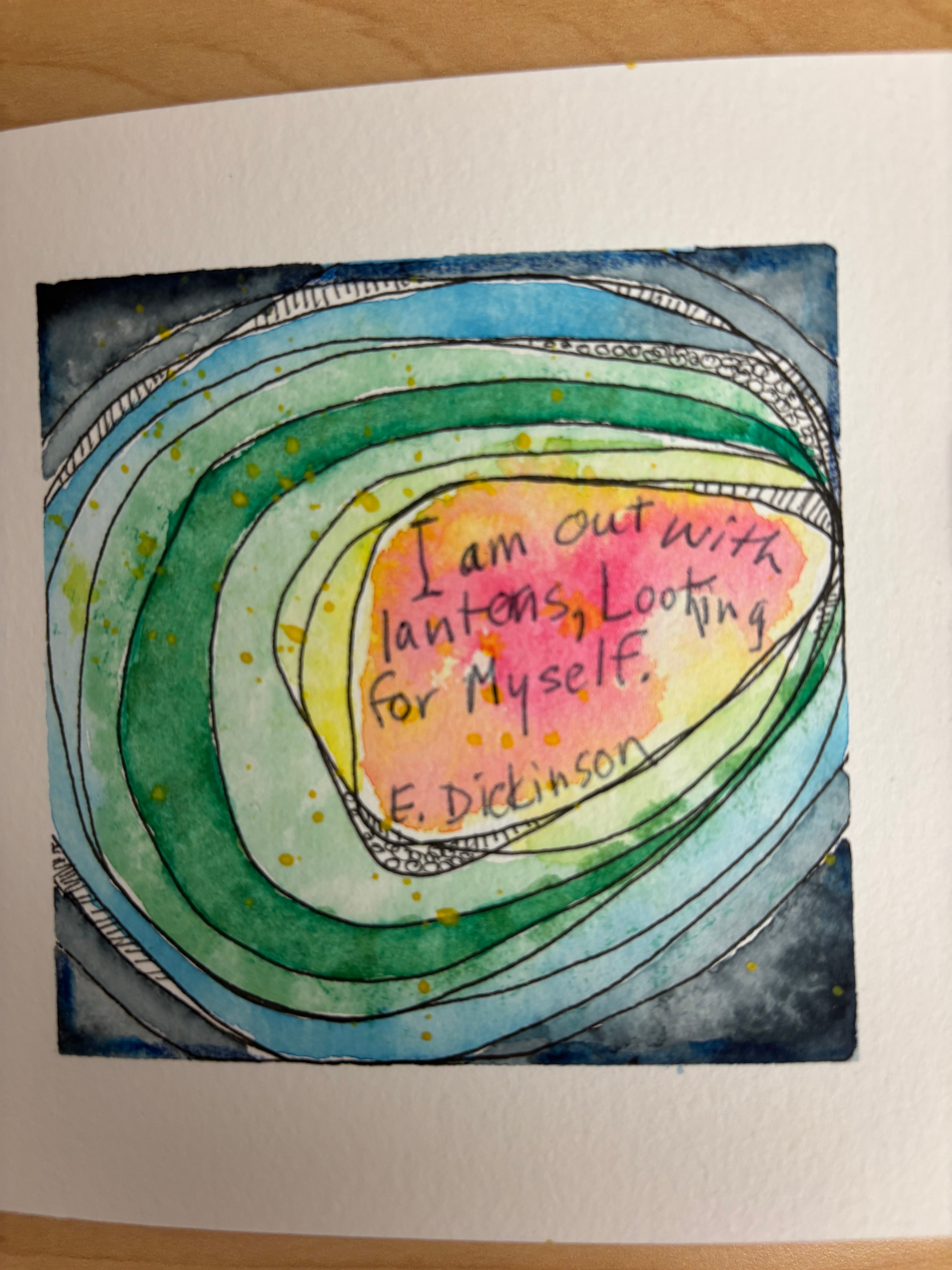 I tried combining text (a quote from Emily Dickinson) and a small painting today. I have zero calligraphy skills, and even though I am a good speller, I always seem to make mistakes. And honestly, calligraphy is not a rabbit hole I care to go down.