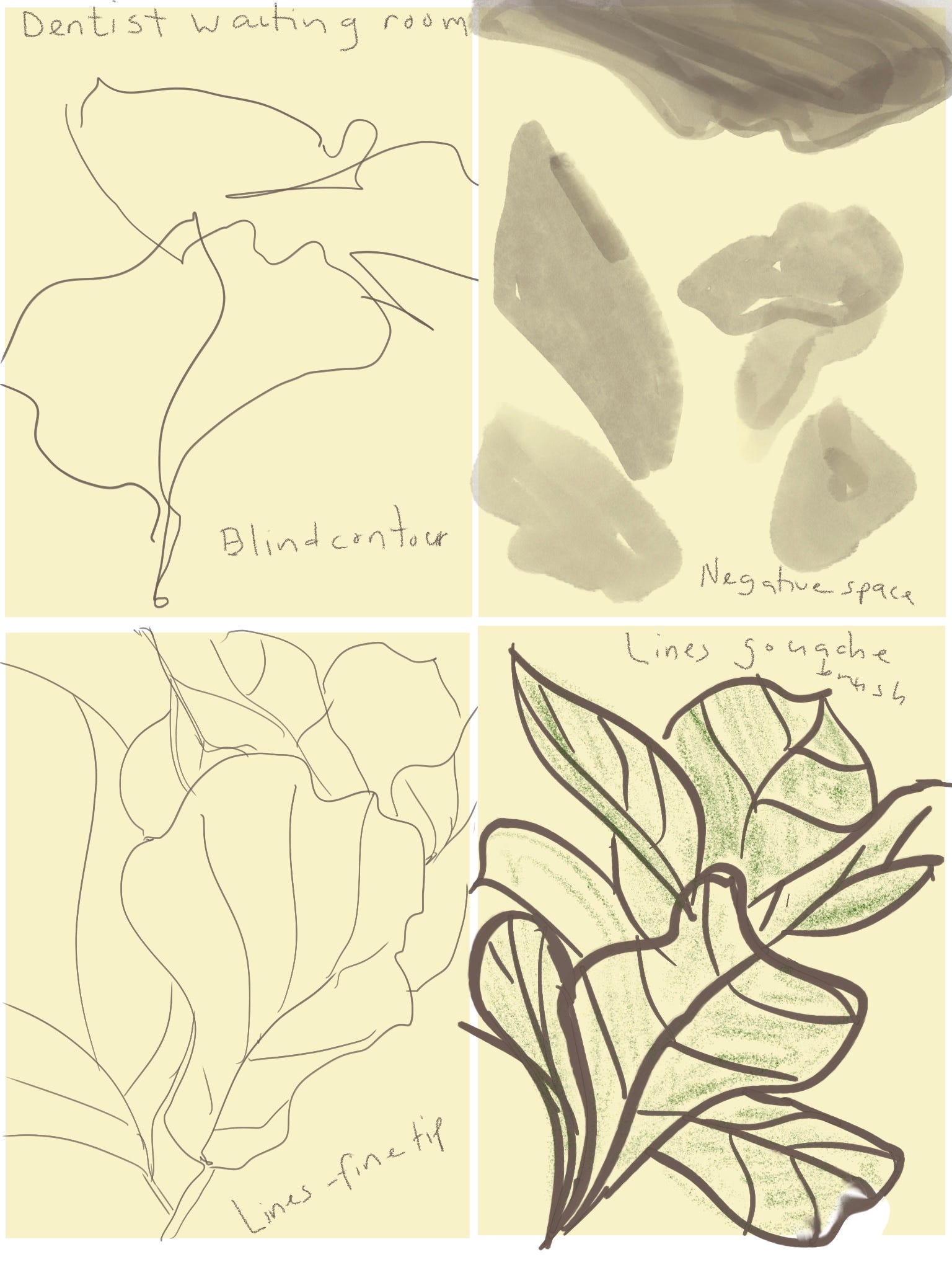 This meant I had more time than expected to sit and stare at the fake plant beside me. I had my iPad in my backpack, so I took advantage of the unexpected sitting time to first do these four quick drawings and then read more of my murder mystery set on a cycling tour in the south of France. It felt like a bonus micro holiday!