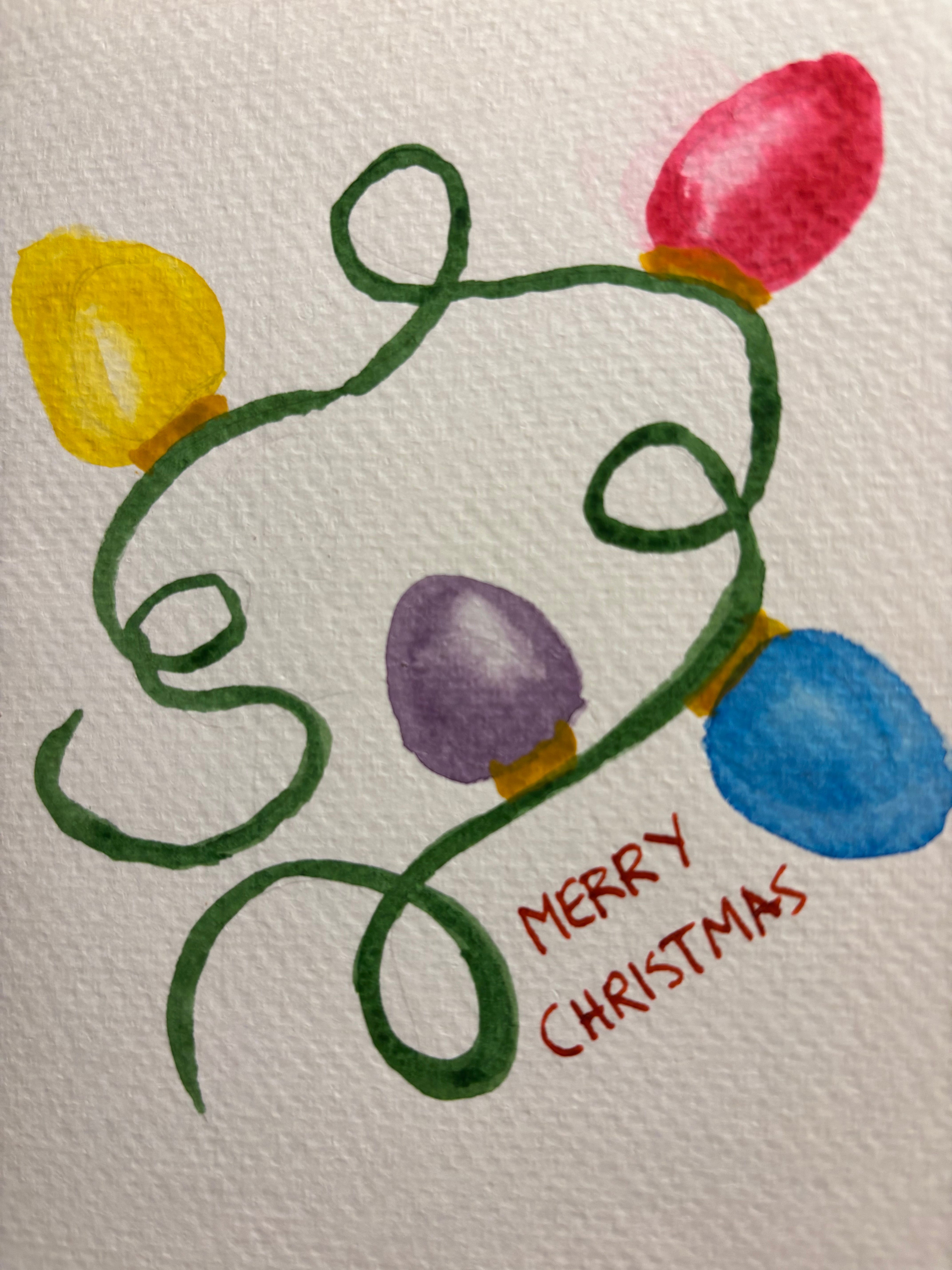 Today I painted a second Christmas card, since I am seeing two friends tomorrow and I want to give them their cards. This one was a lot easier than the one yesterday—not so much faffing around with colours, and highlights. No drop shadows. I have zero calligraphy skills, nor am I interested in learning, so my lettering is always a bit wonky! At least my friends will know that a human made their Christmas card.