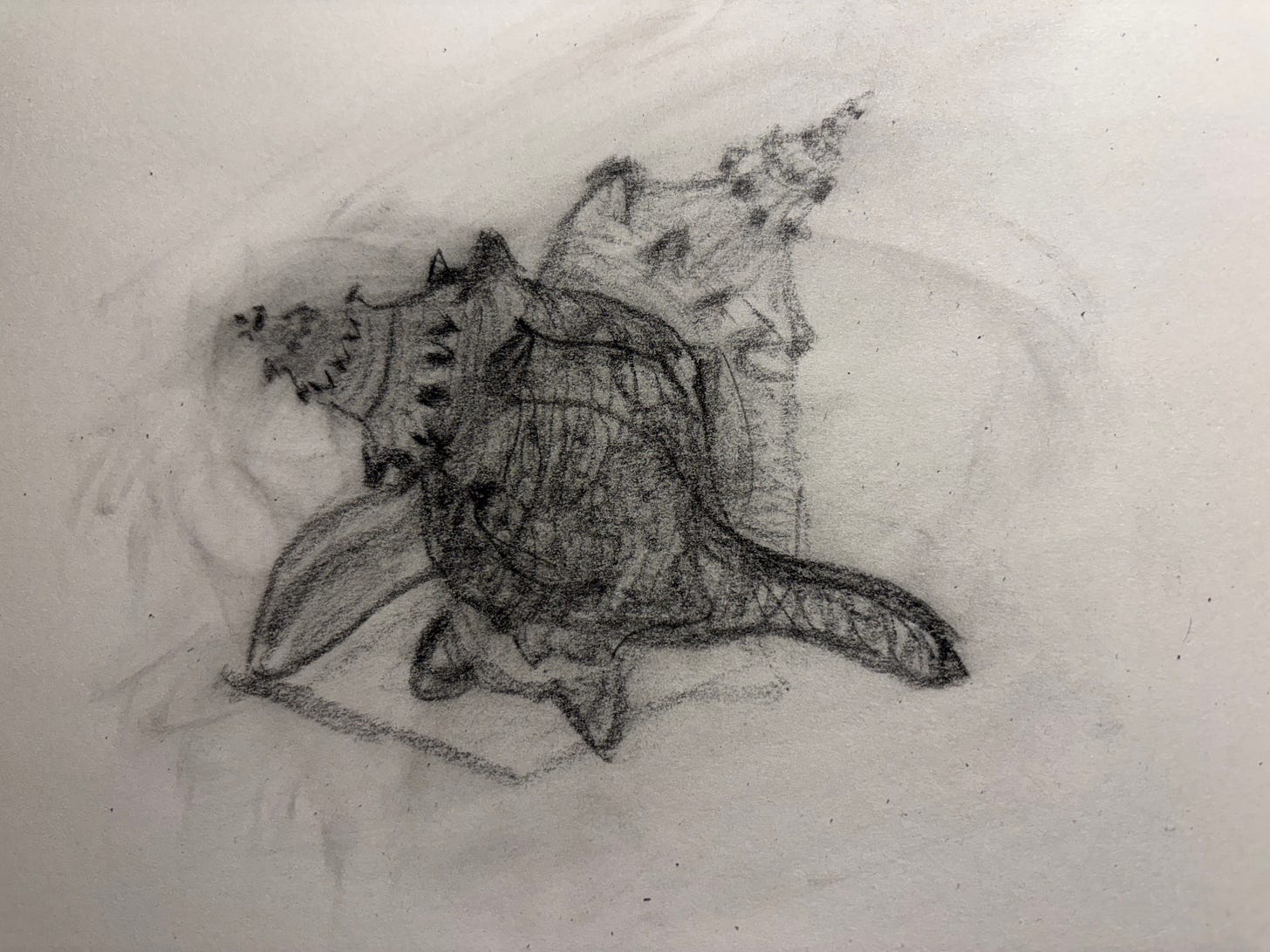 Today’s prompt was to do a loose charcoal drawing of an object, blur it, draw on top of it from another angle, blur that and do a final drawing from a third angle on top. The idea is to loosen up, not be fussy, and see what happens. It’s hard to see drawing number 2 —a very foreshortened shell, but I like the effect.