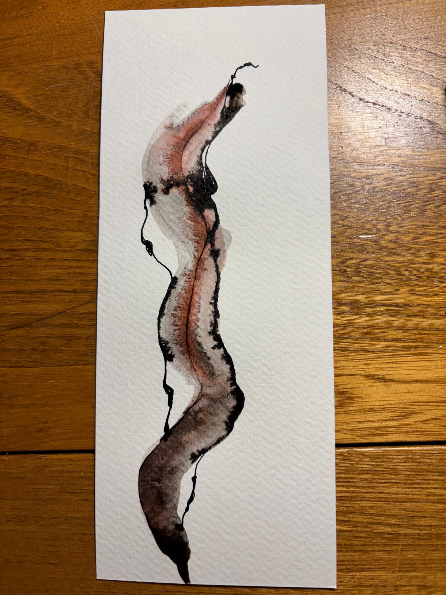 At first glance, I thought it was a person on a ski hill gondola! But then—no snow! My contribution today is an experiment with ink. I only have two colours—black and red— so I painted a grey wash with the black and added red and black details with my dip pen. If I had green instead of red, it would look a bit like kelp. Maybe. Fun to play, though.