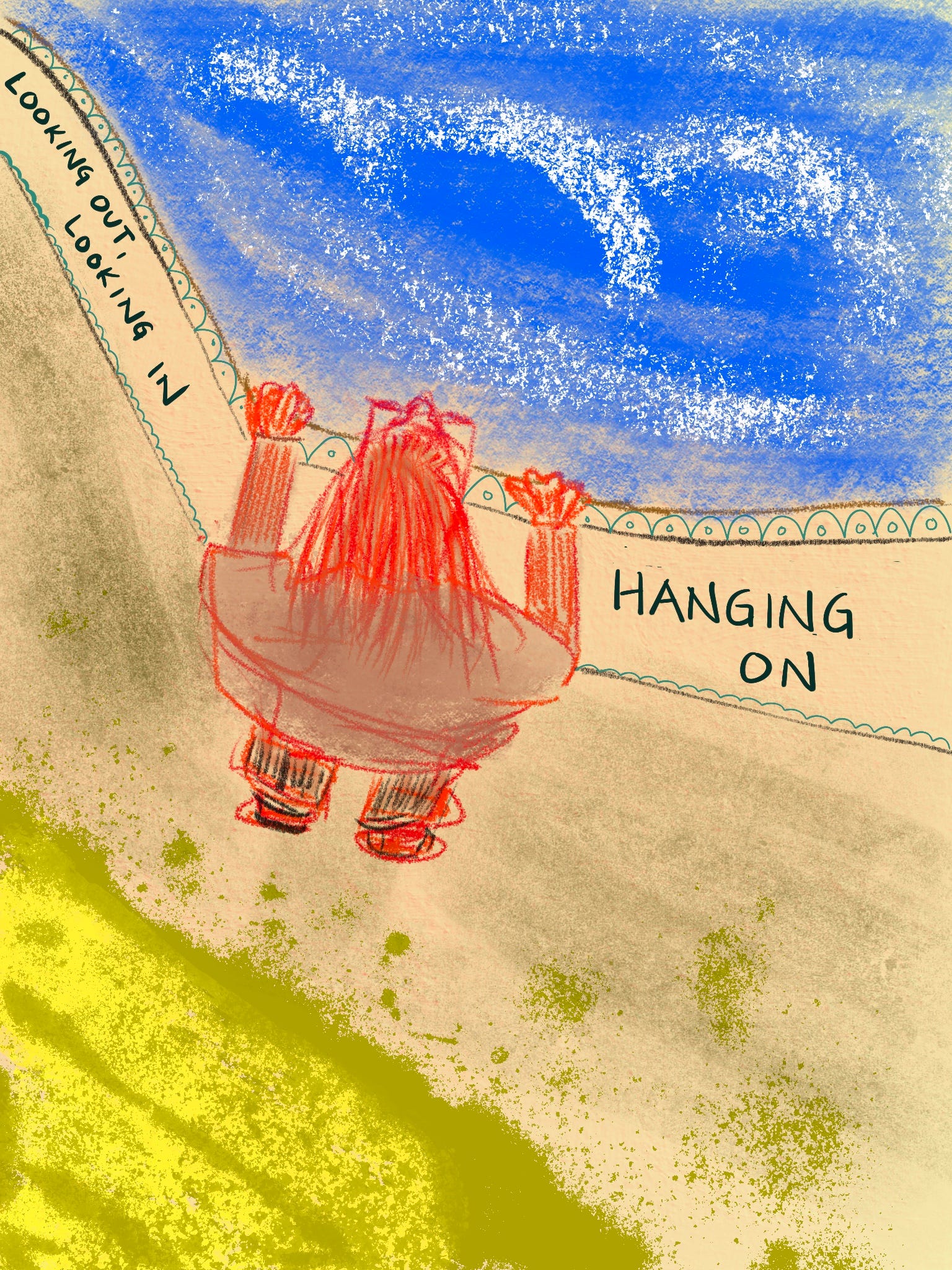Today’s contribution started as an exercise in drawing a familiar subject from an unusual angle. I started with this odd figure (me-ish) sort of from above and behind but just floating in the middle of the page. I couldn’t tell if the person was supposed to be hanging from a rope, looking over the edge of a cliff, kneeling, or? I thought if I suggested some kind of context, things would right themselves.