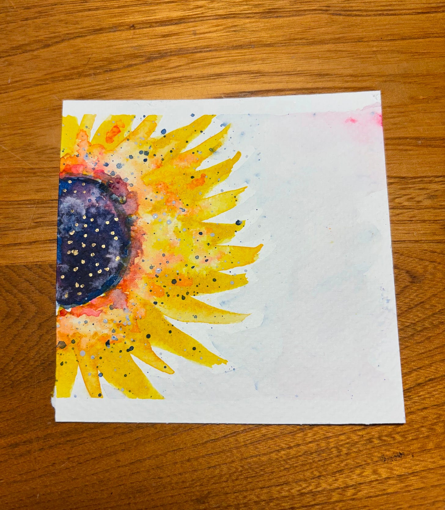 After drying overnight under a heavy book and a hand weight, yesterday’s collage looks so much better—it was so saggy when the paper was wet. Still messy but quite joyful. Full workday today, followed by a walk in the sunshine, which inspired the sunflower I painted—totally out of season, but who cares? Earlier in the day I sketched the solitary tulip on my deck—I didn’t plant any bulbs in the fall, but this one survived and popped up, only to be blown horizontal by the gale force winds last night. I’ll probably paint it for tomorrow’s post.