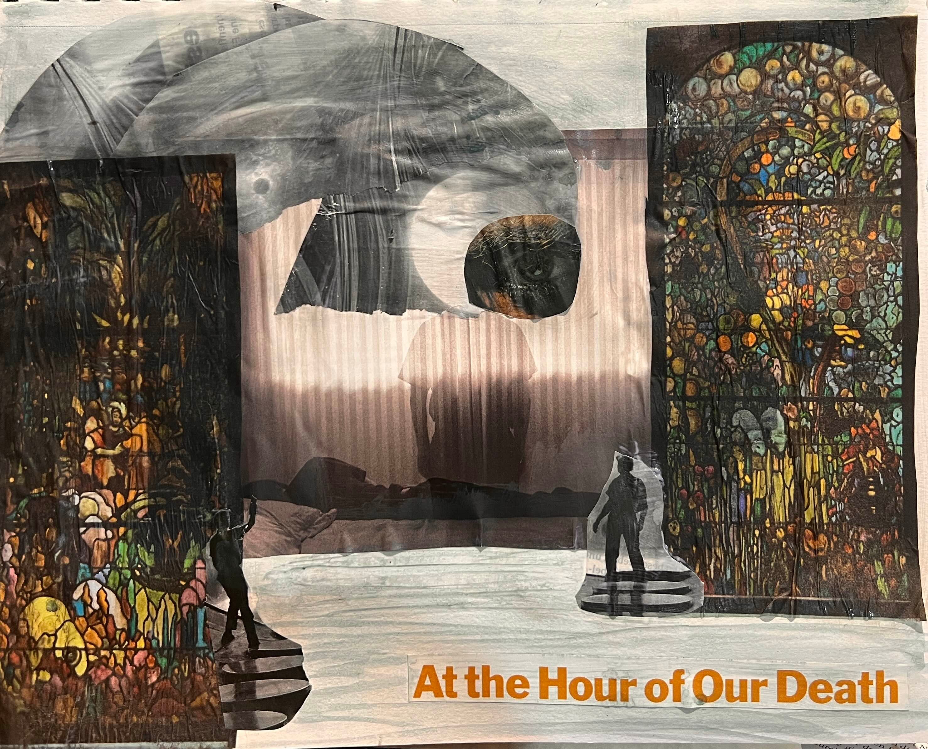Not exactly sure why, except it seemed a good use of some photos of stained glass I had printed onto tracing paper during yesterday’s printing experiments. And then I found this headline and the deathbed photo and, well, the rest just emerged from there…
