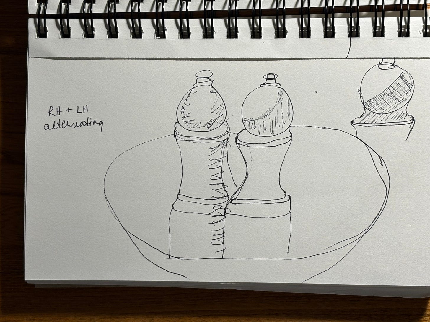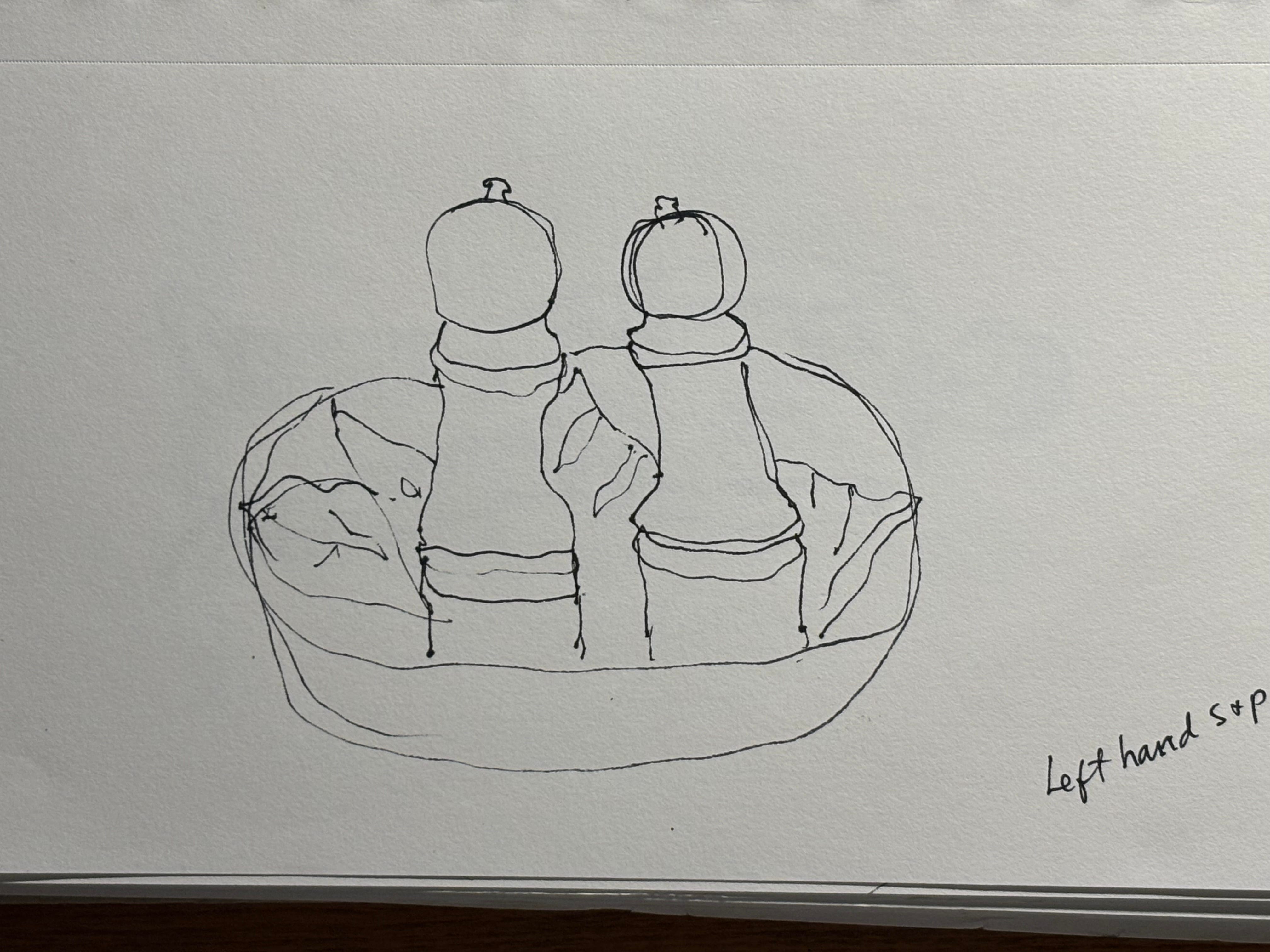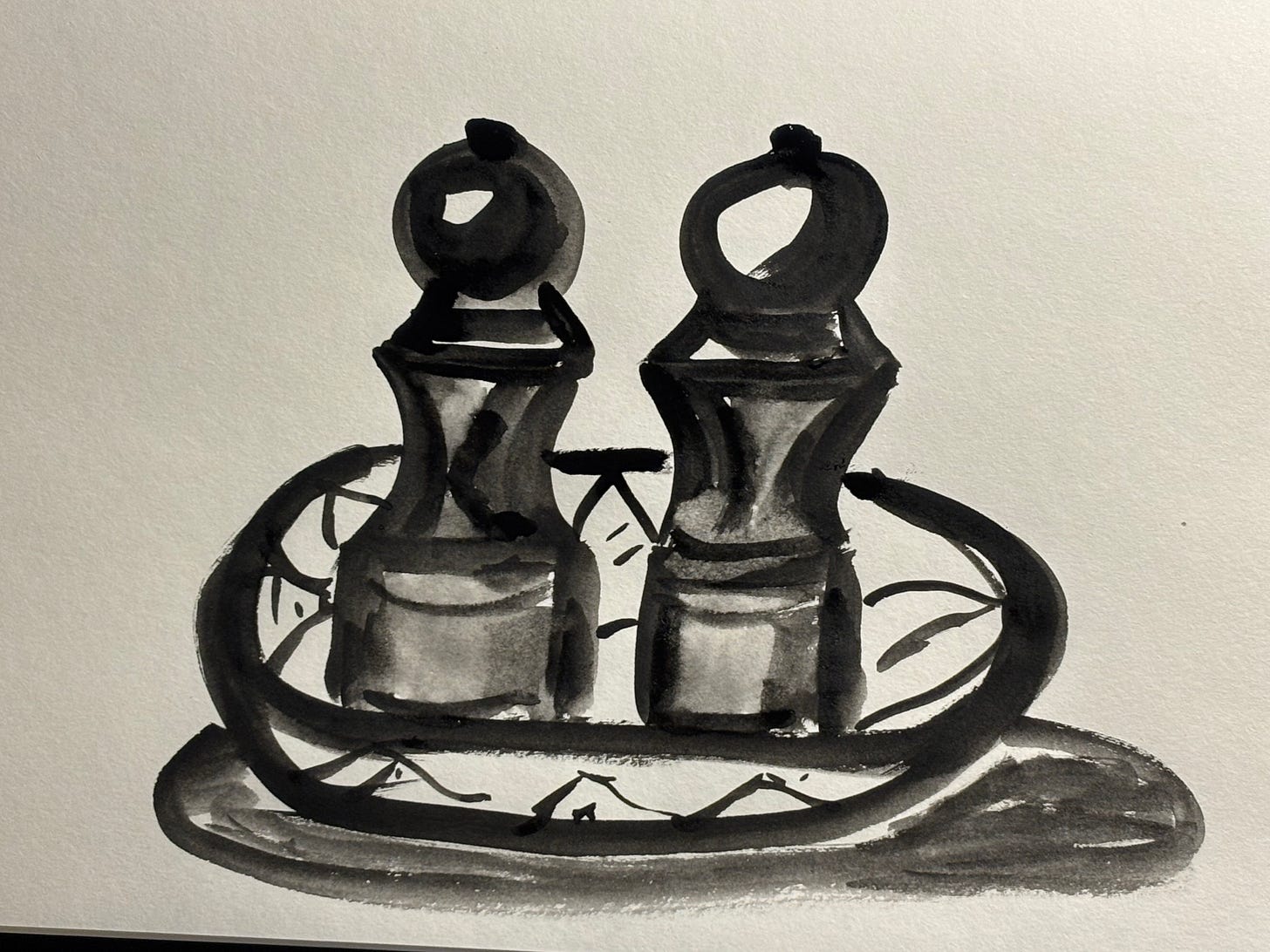 I did a few more DG lessons today, still using the salt and paper grinders as my subject. Left hand only (one minute), then left and right together (one minute each), then a final large rendering on large paper using a big brush and black watercolour (no timer) but still moving quickly. After that I did what he calls a “reverse critique”—moving backwards through all the drawings and finding something positive in each one. My favourite, by far, is the painting.
