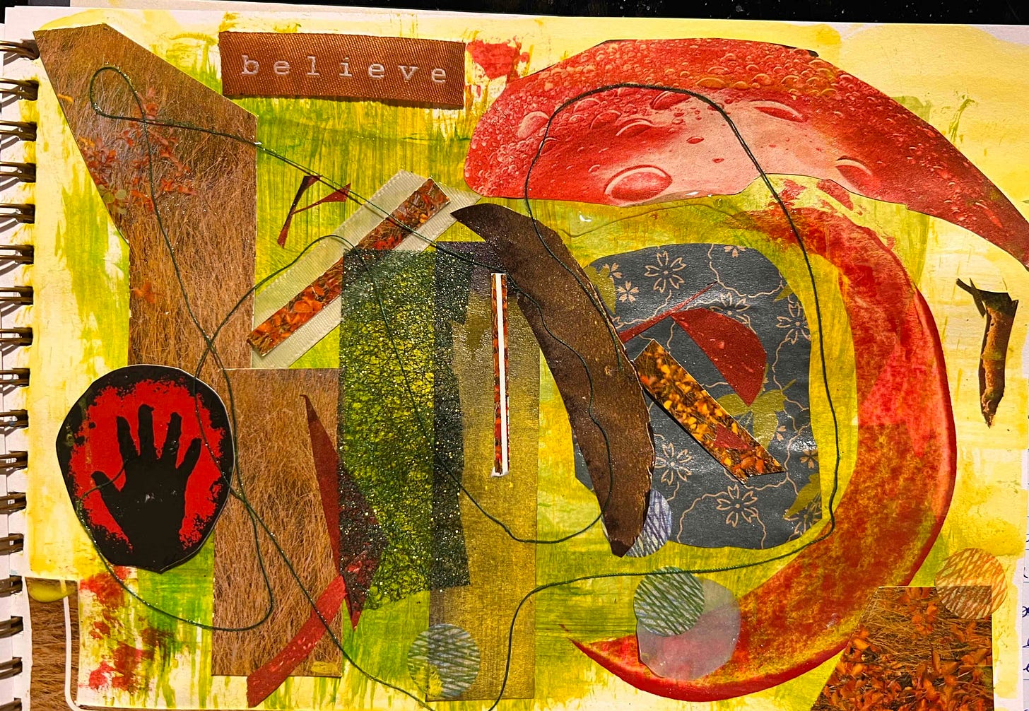 I really like your m-m/collage—colours are fabulous. Shapes are intriguing. (Is that a slug on the right?) Marks seem intentional. Not terrible at all. I think your fatigue is talking when you call it a dog’s breakfast.