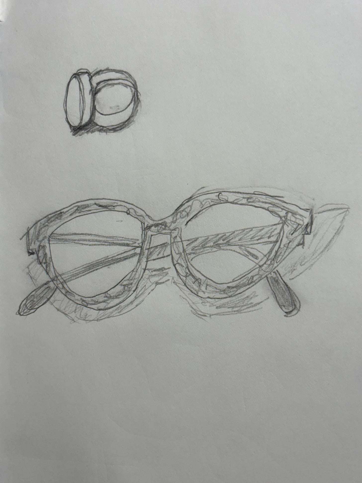 I sat at a big round banquet table by myself for a while (by choice) and drew my ring and my sunglasses. And thought about the fragility of life, as one does at such events. As always in most social situations, I wished I drank, but nobody wants to see a 75-year-old woman dance on tables, do they? Or fall off.