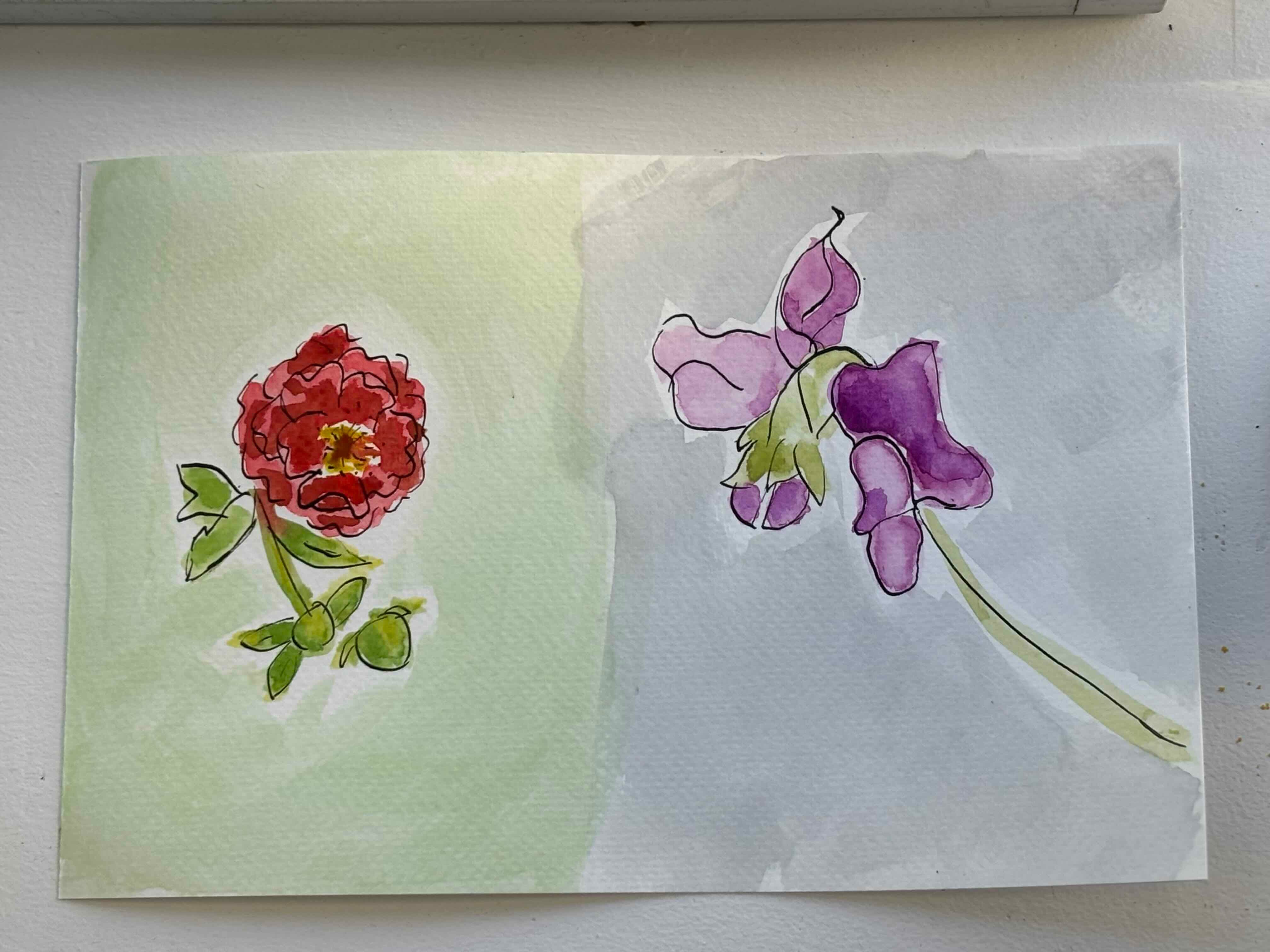 Spilled the ink (not on the painting) and didn't get the red right on the geranium and flubbed the drawing of the sweet pea against a grey fence. Going too fast, not paying enough attention.