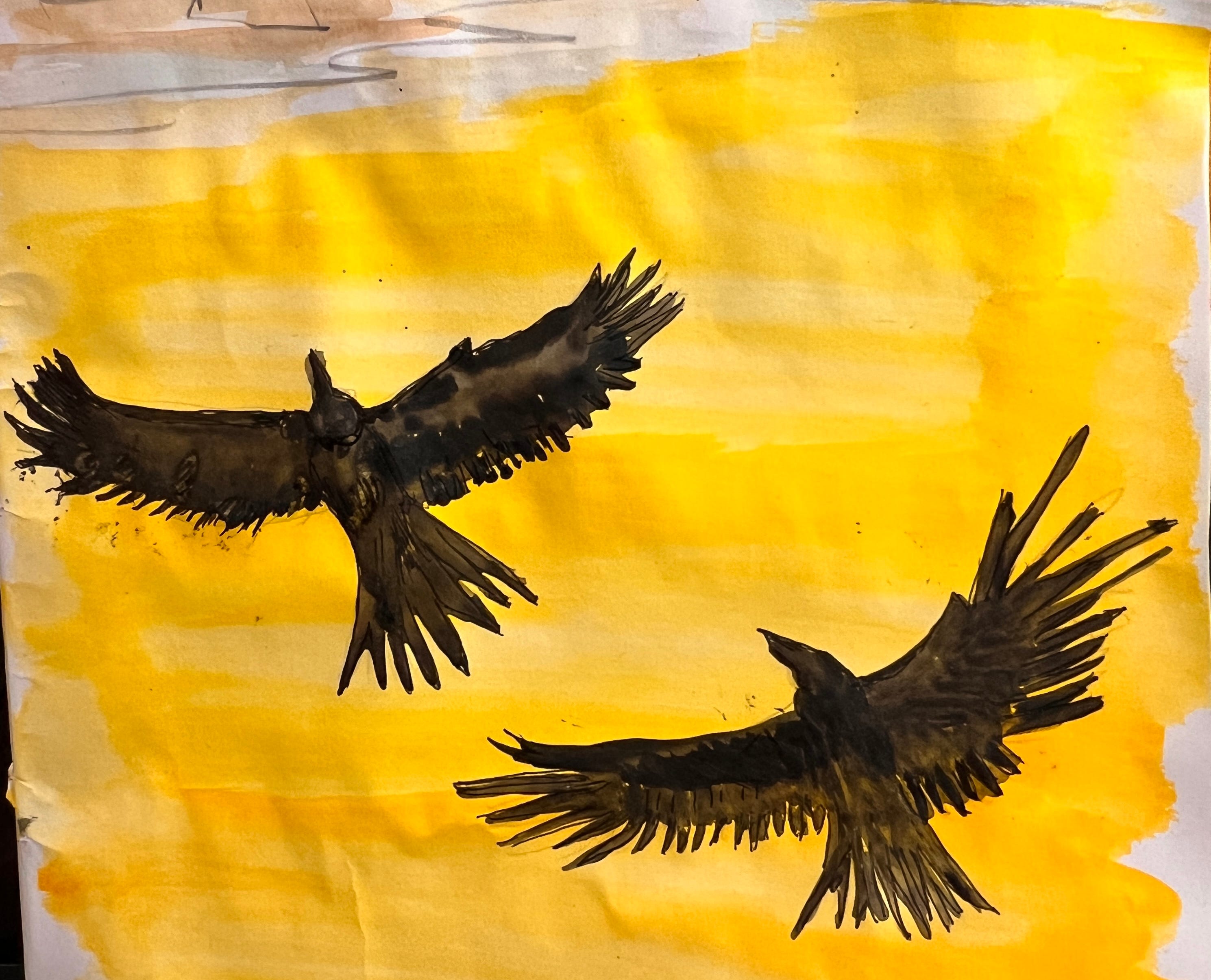 Why do ravens (clever, sociable, funny birds that they are) have such a dark and menacing reputation? As our hero approaches the stronghold, ravens. And, a yellow landscape suggesting the mountains are about to run out and open into the barren landscape beyond, a desert that nobody crosses.