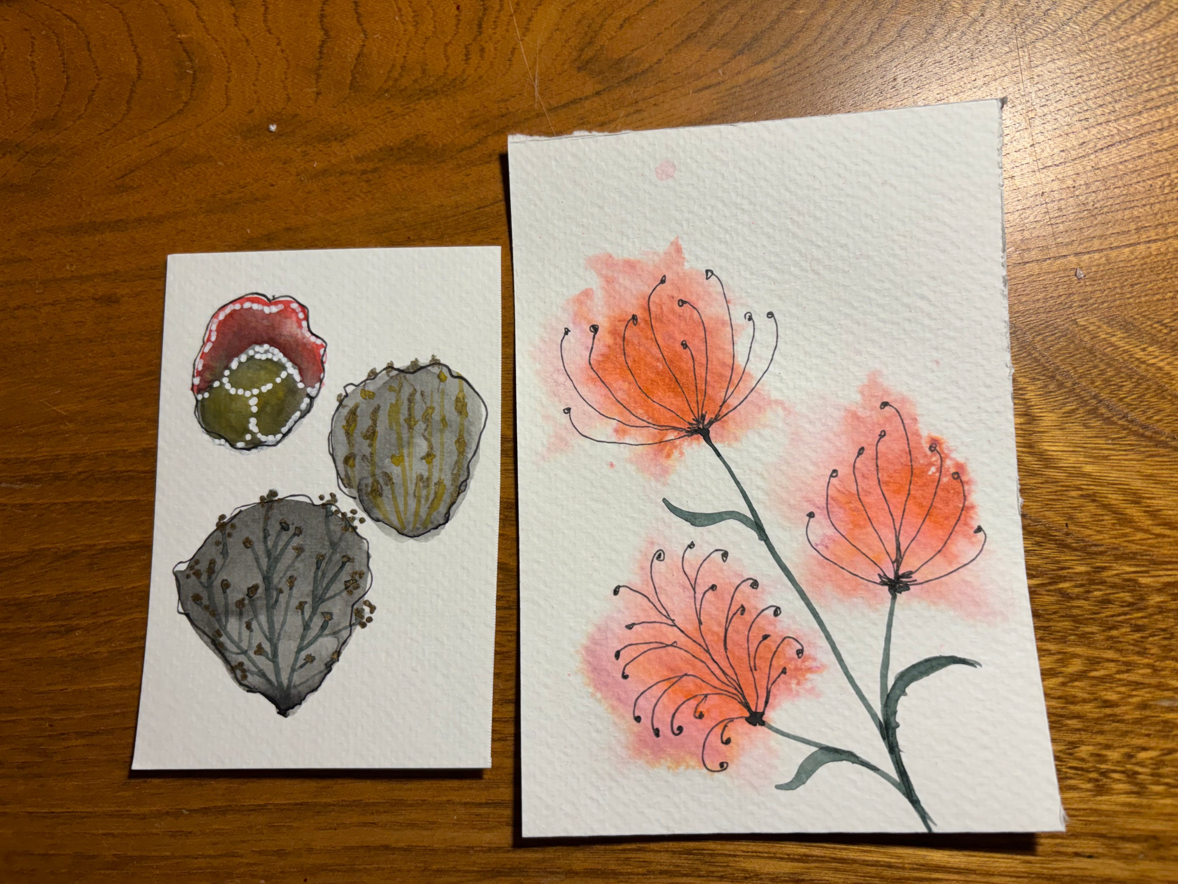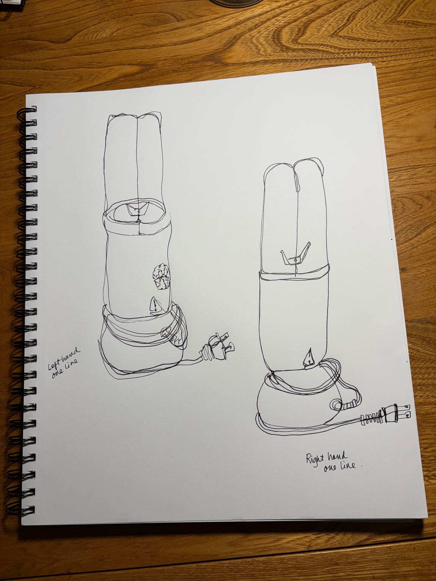 Today I fooled around with ink and watercolour and some new pens—white, silver, gold and copper—seeing if they would show up on a dark background. I think they will show up really well on black paper, but not so much on a dark gray. Then I dropped some red ink into small puddles of water and turned the puddles into flowers. Meh. My dinner wasn’t quite ready, so I did another set of left/right drawings in ink, never taking the pen off the page as I drew my Nutri-Bullet And once again, I think I like the non-dom hand drawing better, even though I made a rather large mistake. It matters not.
