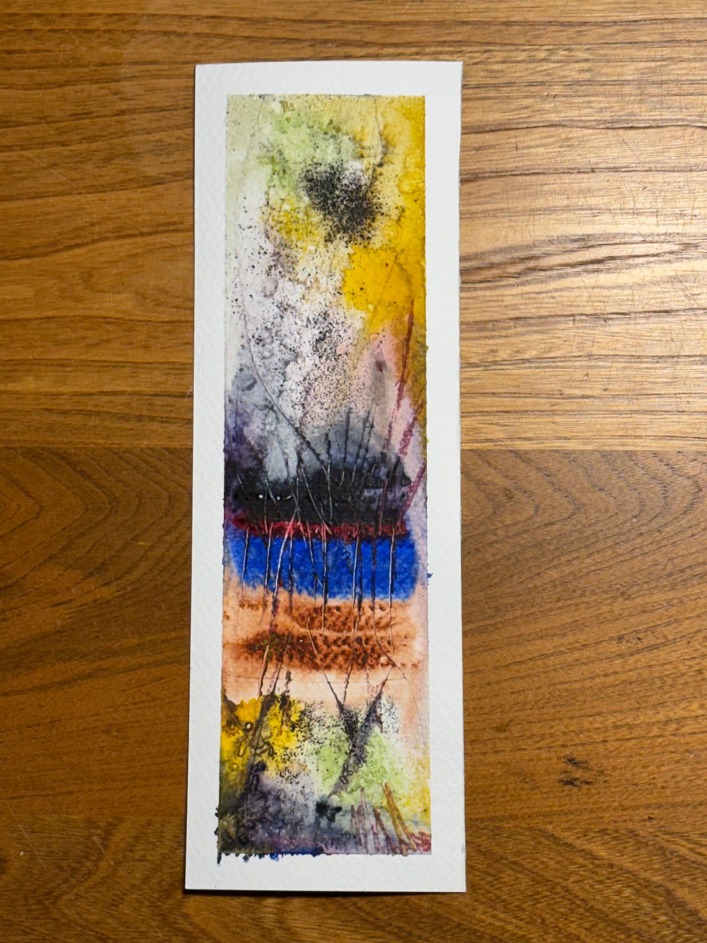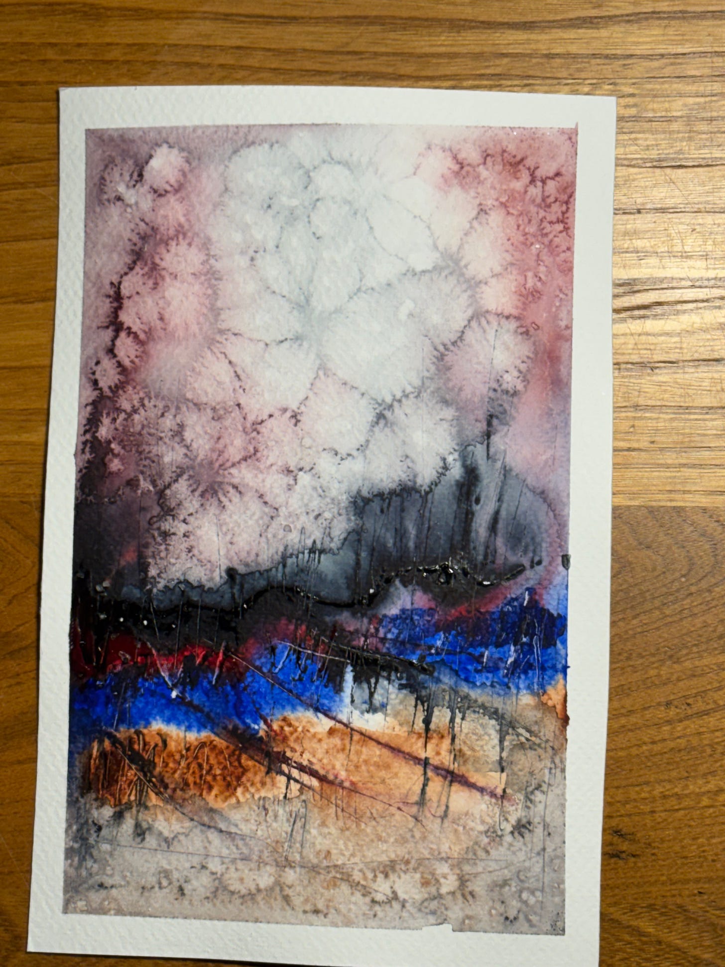 Today I fooled around with very wet paper, blobs of paint straight from the tube, smeared on with a cut up credit card, which was also used to create lines and move the paint around. I added some coarse salt and a bit watercolour pencil dust (made by rubbing the pencil on rough sandpaper). Wild, wet and very satisfying to make.
