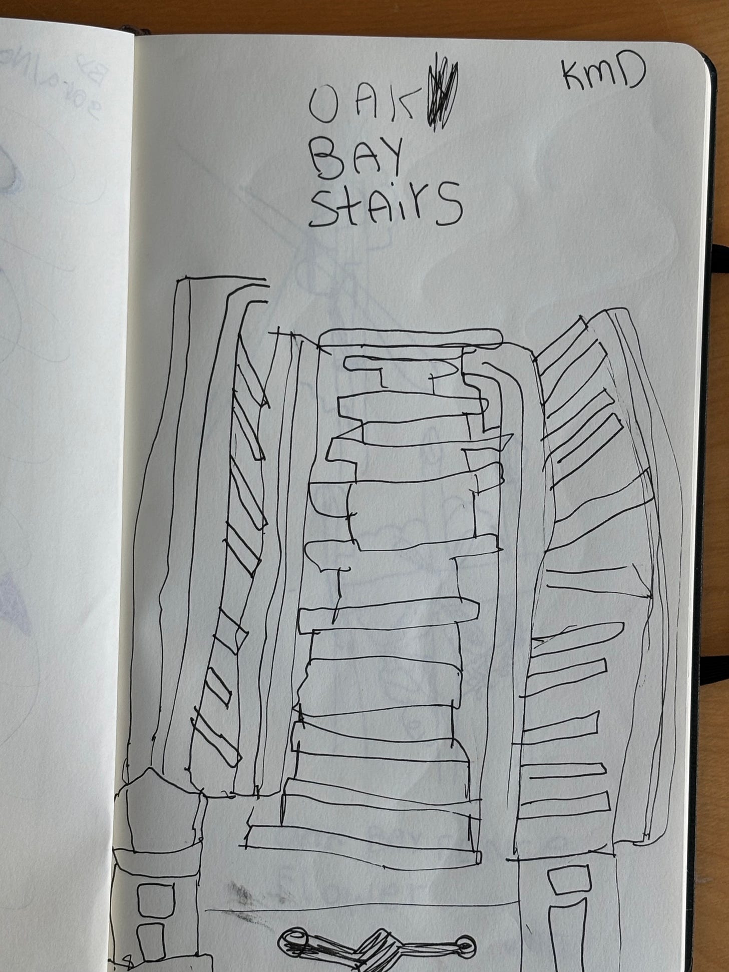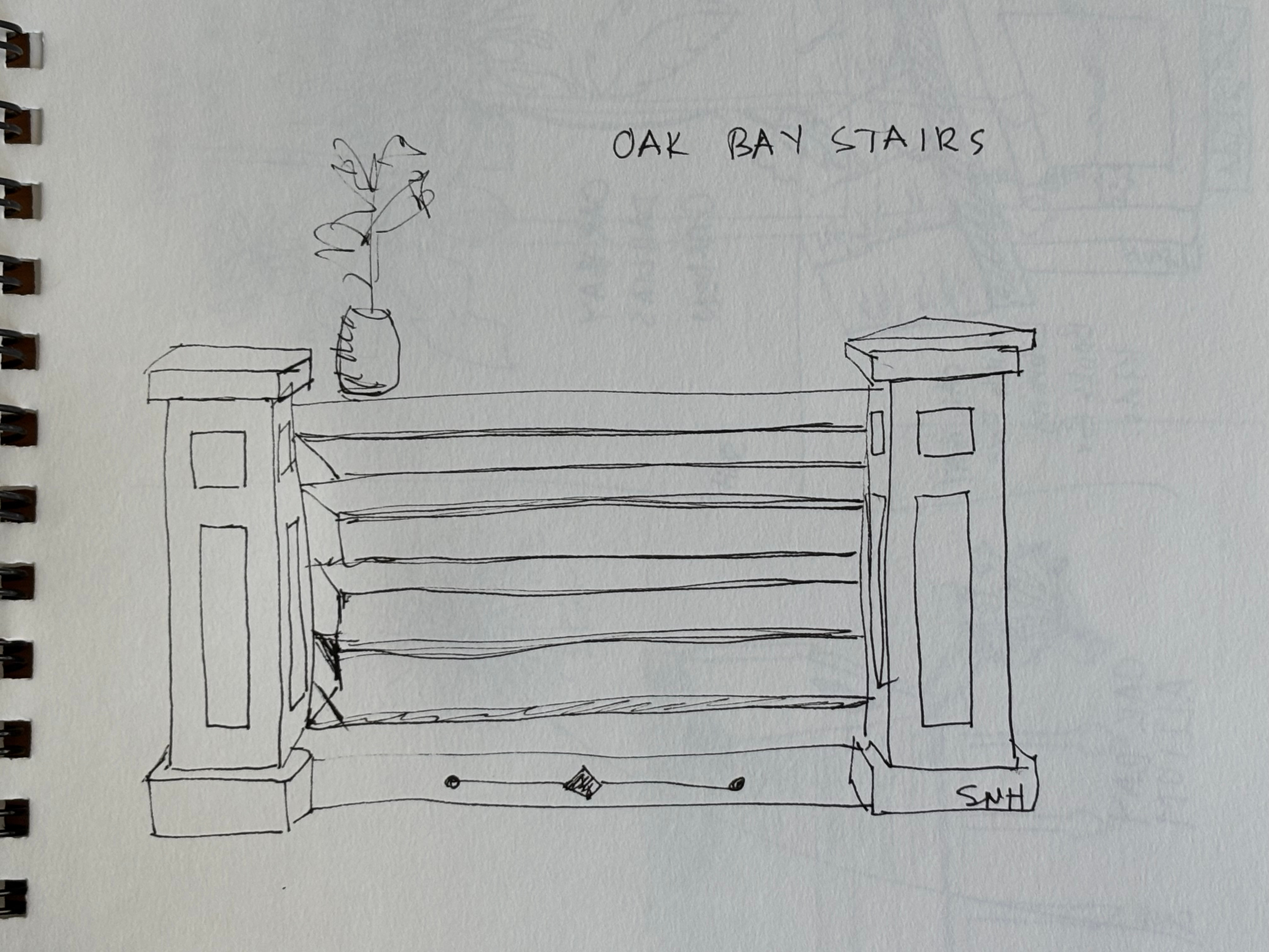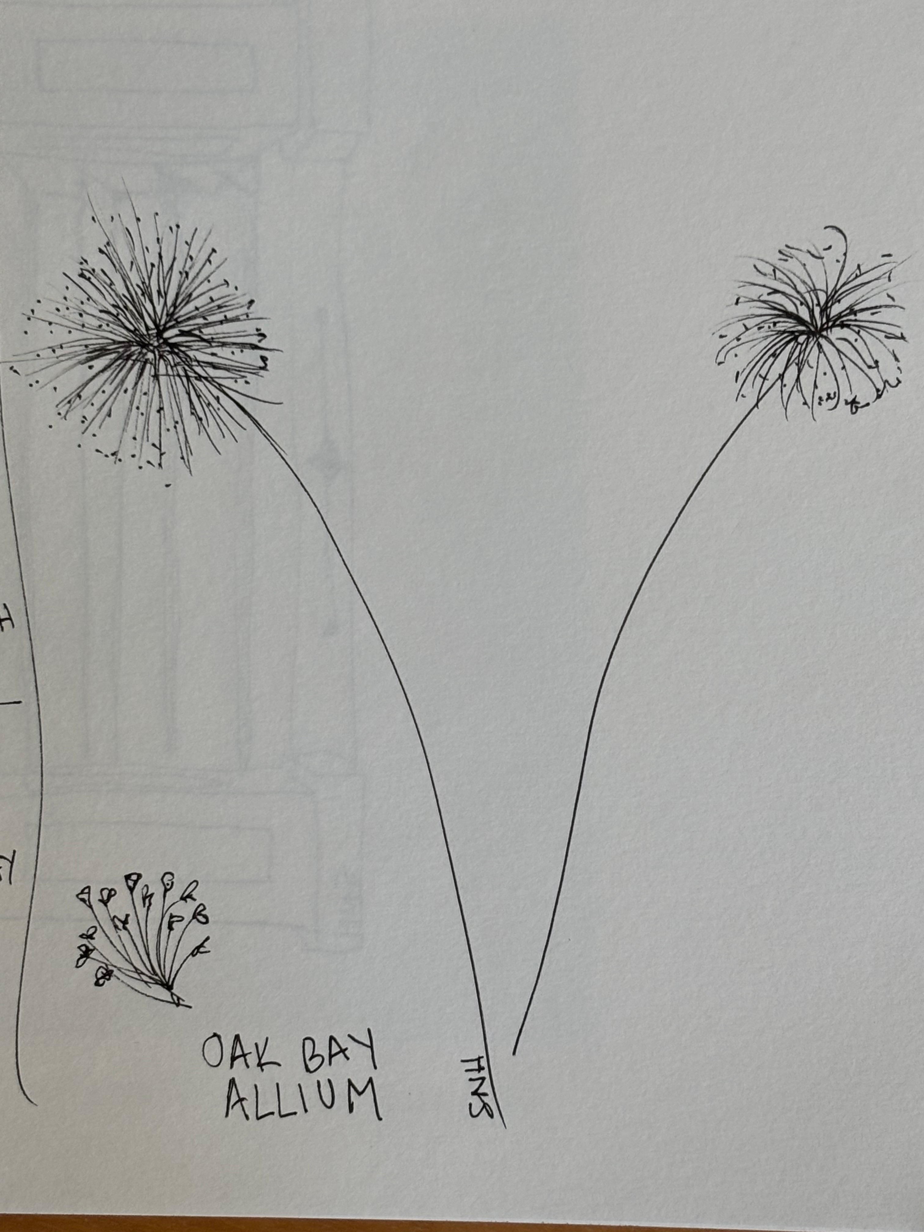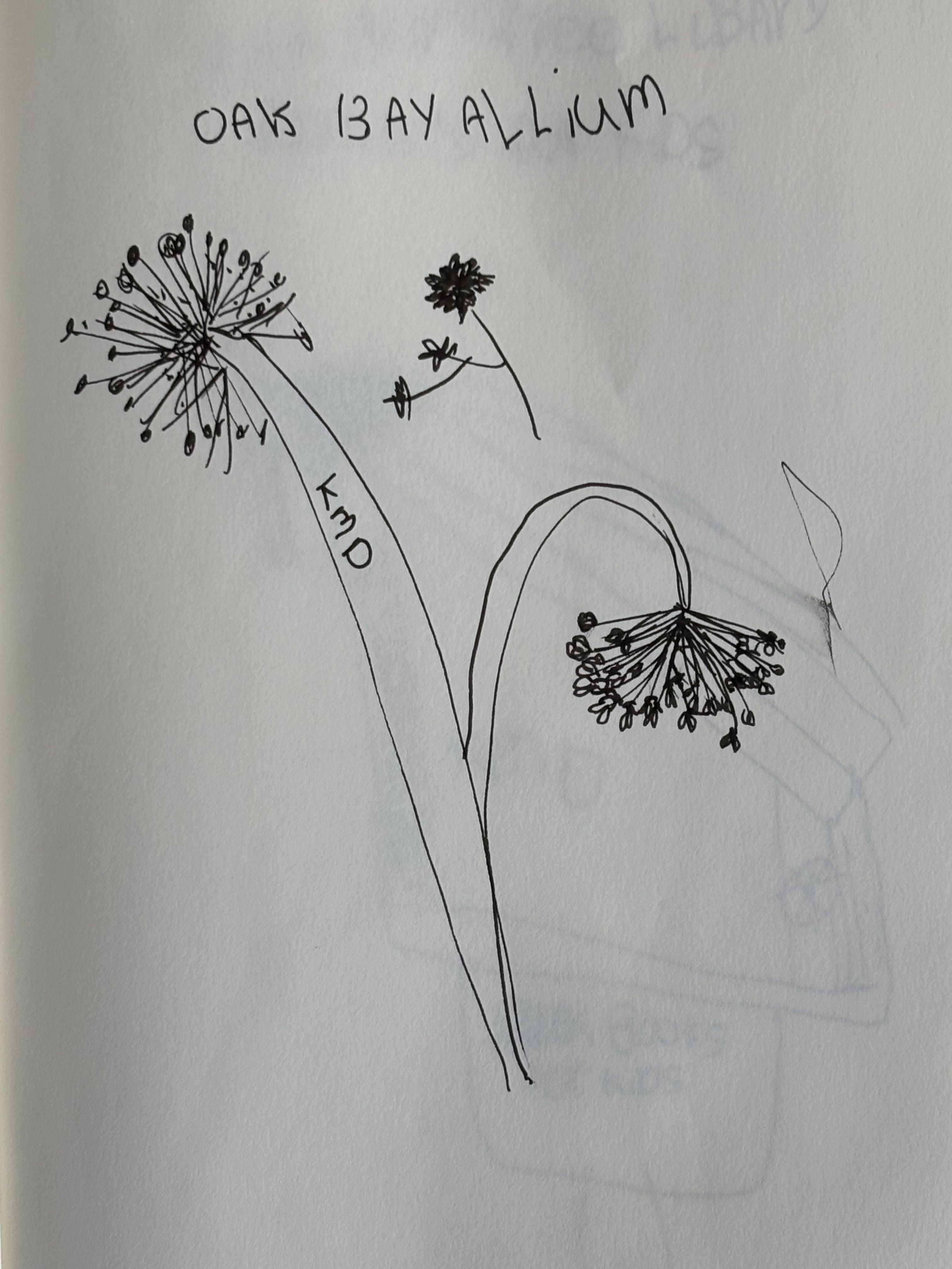 I think all experiences form memories—some long-lived, some fleeting—but lasting memories are formed by repeatedly accessing the memory over time, creating the pathways in the brain that allow easy retrieval. I like to think that I will remember the taste of a local strawberry on my cereal this morning, the feel of my granddaughter’s hand in mine, the sound of her squeal when a wasp stung her foot, the sight of the peering closely at a flower, when my state of mind was calm and happy. As we walked, we alternated choosing what to draw. The first thing Kianna chose was the front staircase of a lovely house. I love her version—she is unfettered by worry about perspective, and the stairs look alive (if not scaleable). Then we drew some dried alliums—she noticed that the seed pods are not actually dots, but tiny hearts. We talked about how artists look really closely at things, and she took it to heart. What a girl! We did seven drawings each before the wasp arrived to spoil our fun! Here are two of hers and two of mine.