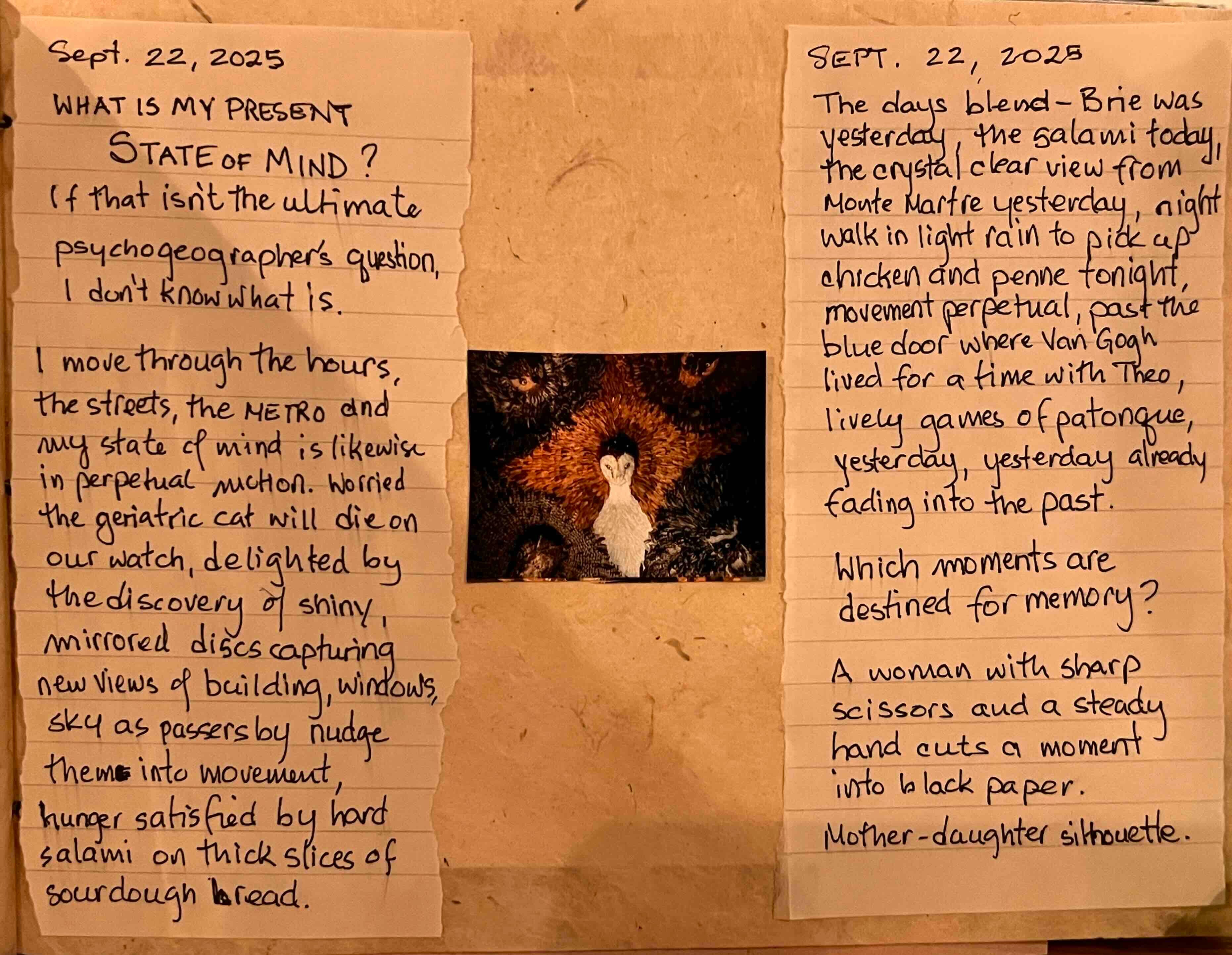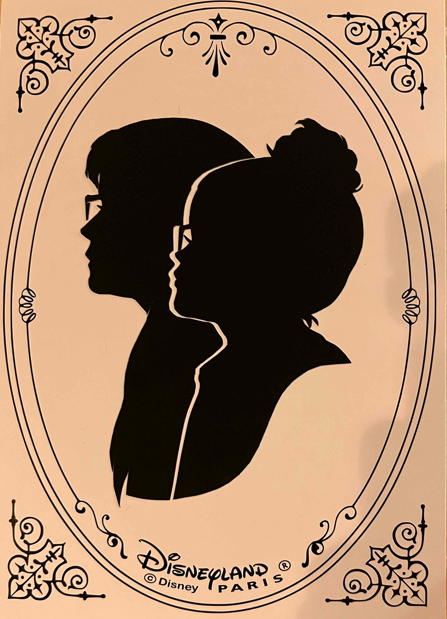 In part because Dani’s project involves a map of Disneyland and in part because Dani never passes up an opportunity to visit the magic kingdom, we made a trip to Paris Disneyland. Though I am not inclined to purchase souvenirs, we could not pass up the chance to have our silhouettes cut out - by hand, by a lovely woman with sharp scissors - not AI, not a 3D printer, not a laser cut/scanned/or otherwise assisted by a device- a person with a great smile and much skill - the moment is now preserved in the scrapbook. Perhaps that will help hold the memory close even as the sick cats, the evening rain, the aching feet fade away into the distant blur of whateverness into which most of our lives disappear.