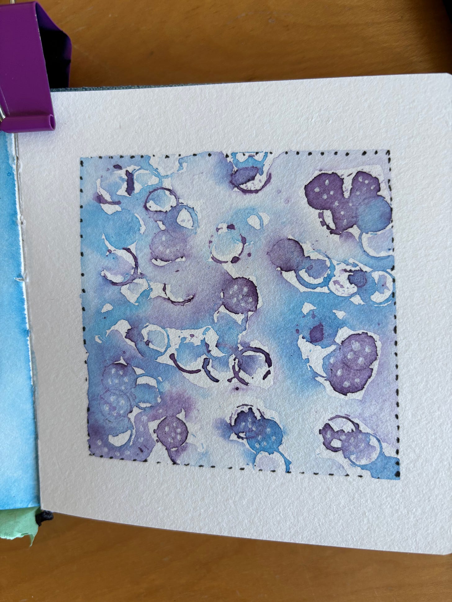Today’s little painting of blue bubbles was done with the cap of one of my Sakura pens. Depending on the amount of paint you dip it in you either get an outline of a circle, or a solid one. Nice effect, which of course I learned from Instagram. Unfortunately, I feel as if I’ve veered off into “magpie mode”—ooh look at that shiny new thing/technique—the shiny thing often involving new art supplies etc. Do I need rubber stamps? Should I try collage? What about trying acrylics again? When I looked at your dad’s sketch of you at the table, I felt as if I could learn as much just from looking at it as I could from “light and shade” a tutorial online.