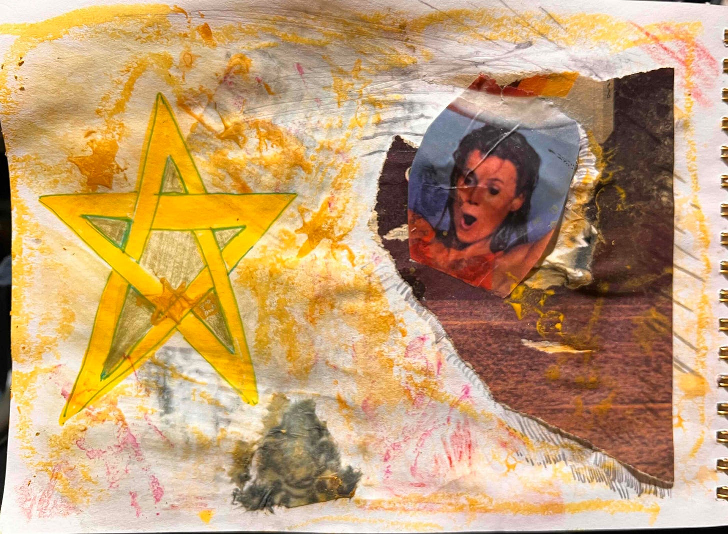 For example, the technique where you take a bit of clear packing tape, stick it on top of a magazine page, smooth it down, then soak it in water before rubbing off the paper to leave the image stuck to the tape (as per the hooting woman) seems a tad… useless? Why not just cut out the image and stick it to the page? As it is, there’s now this shiny tape layer that is difficult to work over with anything else.