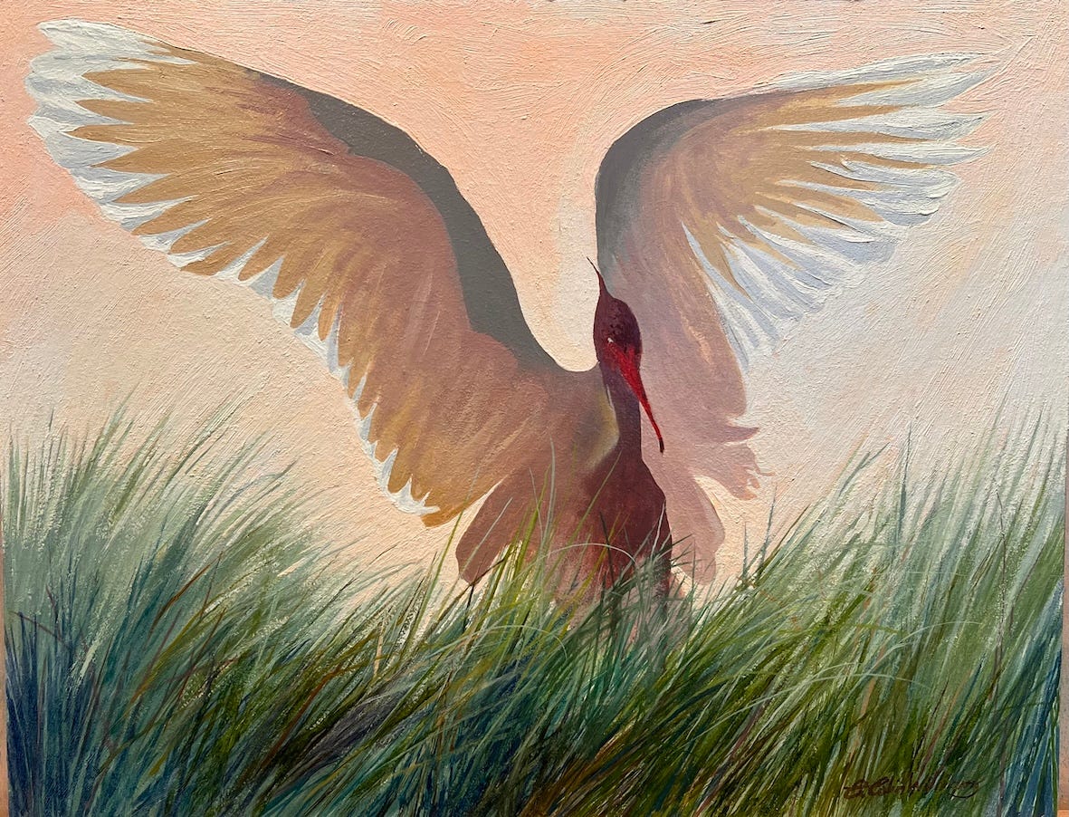 If I decide to redo this, I’ll turn the figure around so she is facing the viewer… either that, or I need to find another bird taking off from behind. Or maybe I’ll get rid of the smallest bird in the middle and just go all in on the wings.