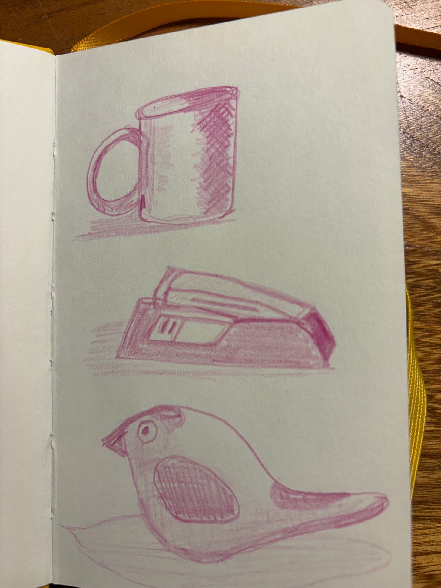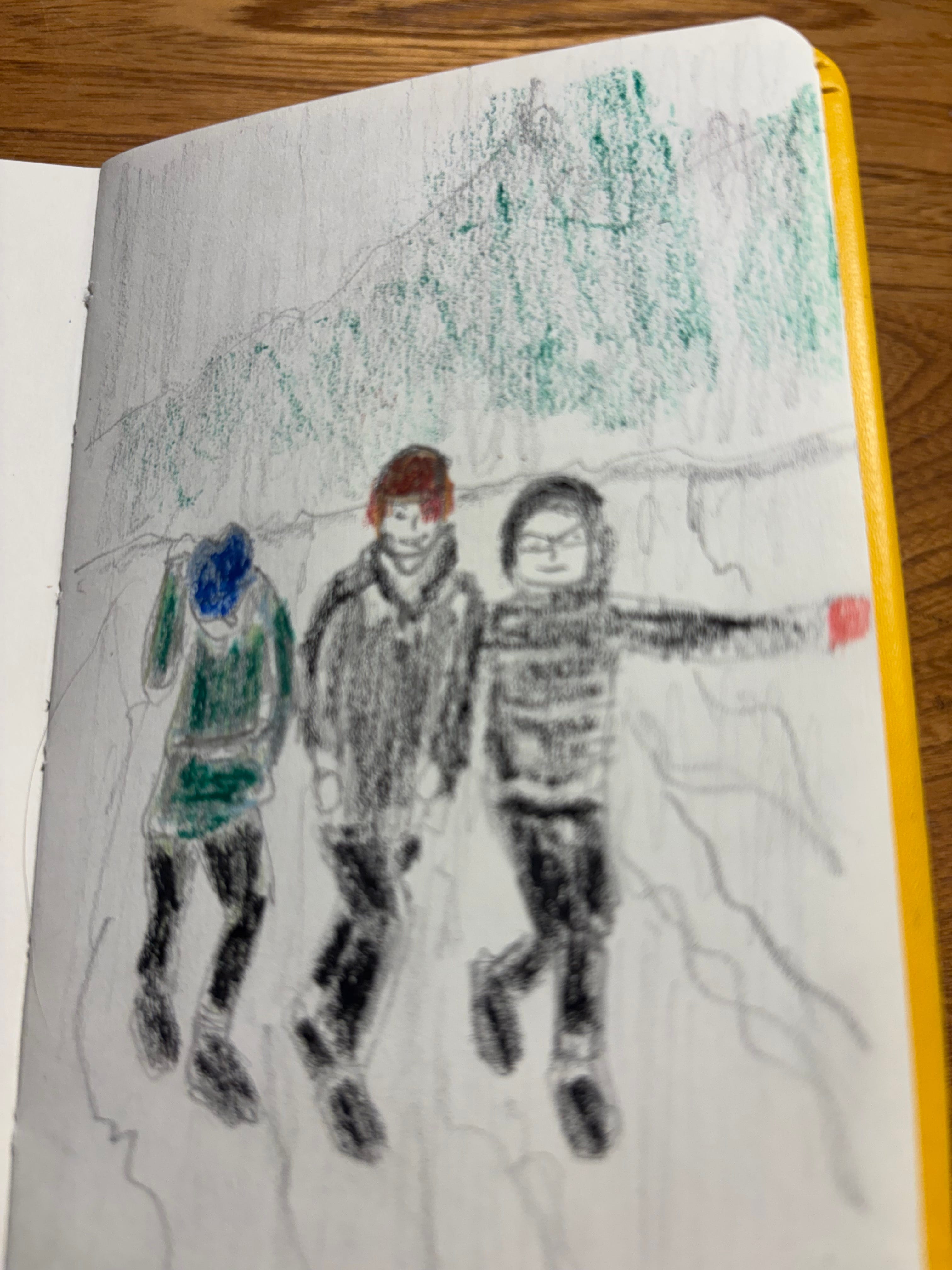 Catching up on the sketchbook course today, drawing in a tiny sketchbook (3”x5”). Assignments were 1) to draw three objects using only one colour, concentrating on tone, 2) draw using 95 percent one colour, with a pop of one other colour, and 3) draw something that uses perspective. The last drawing was done from a photo of Heather and her two friends on Long Beach last weekend. Heather’s the one with the red mitten. It all looks blurry, but that’s the drawing, not the photo, I think. It was a rainy day.