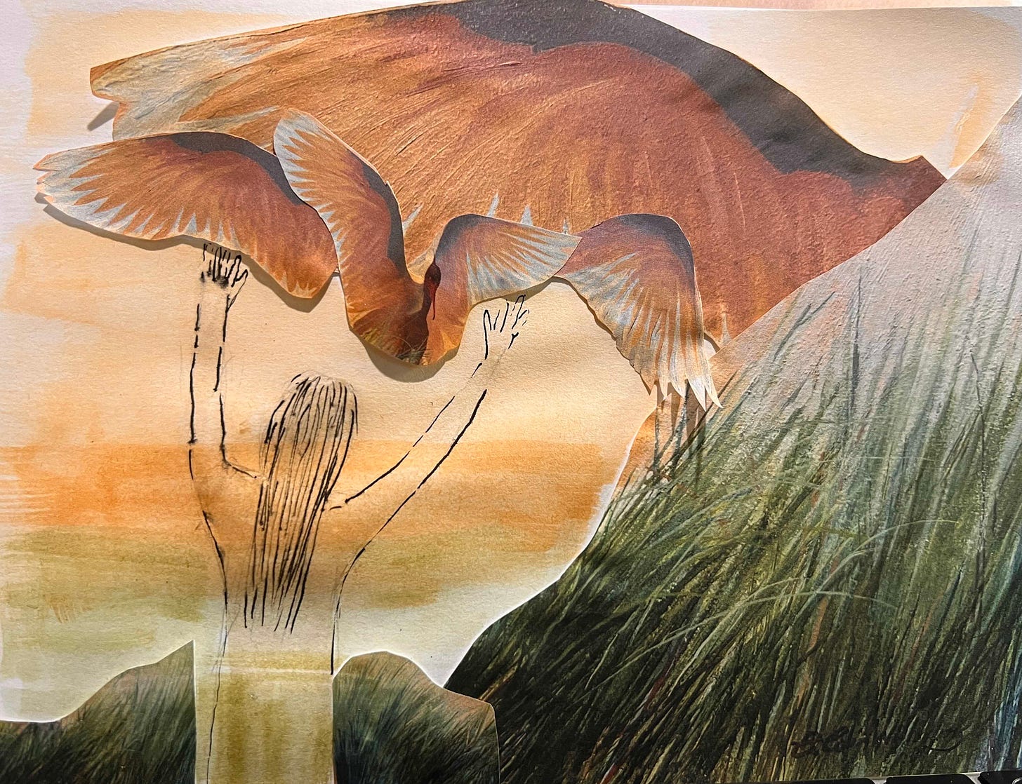 The original painting, sent to my printer several times in different sizes, was one of my dad’s - I know he wouldn’t mind me cutting it up and reassembling it as I have done. The effect isn’t quite what I was going for (full metamorphosis into bird), but there is some aspect of this I quite like.
