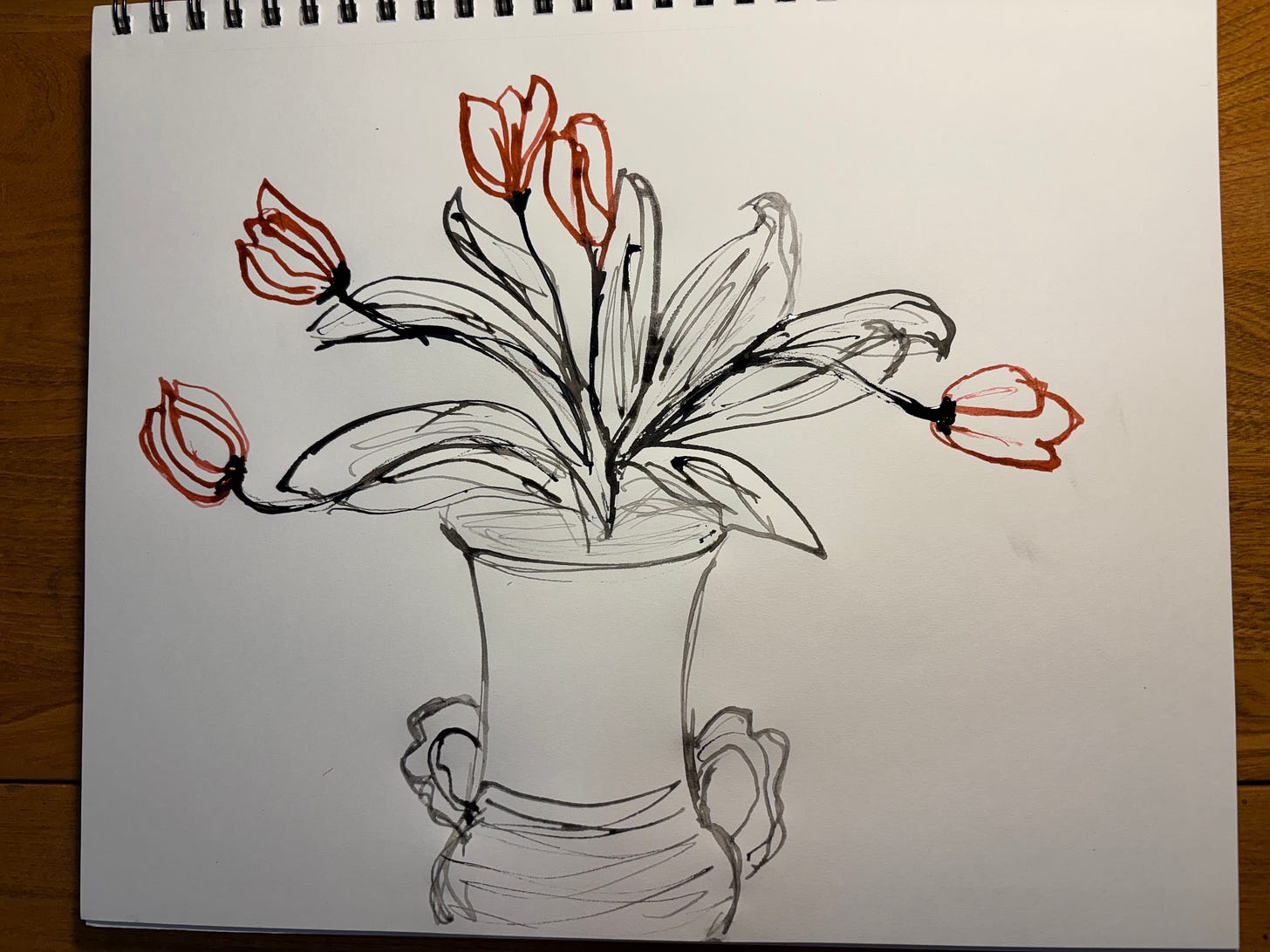 I had what felt like about a hundred needles in my body today, but to no avail. So I came home and drew the floppy tulips with ink and a stick. I like the drawings more and more as time goes on. Who knows what tomorrow will bring? Time to wrap myself in the heating pad again. Sigh.