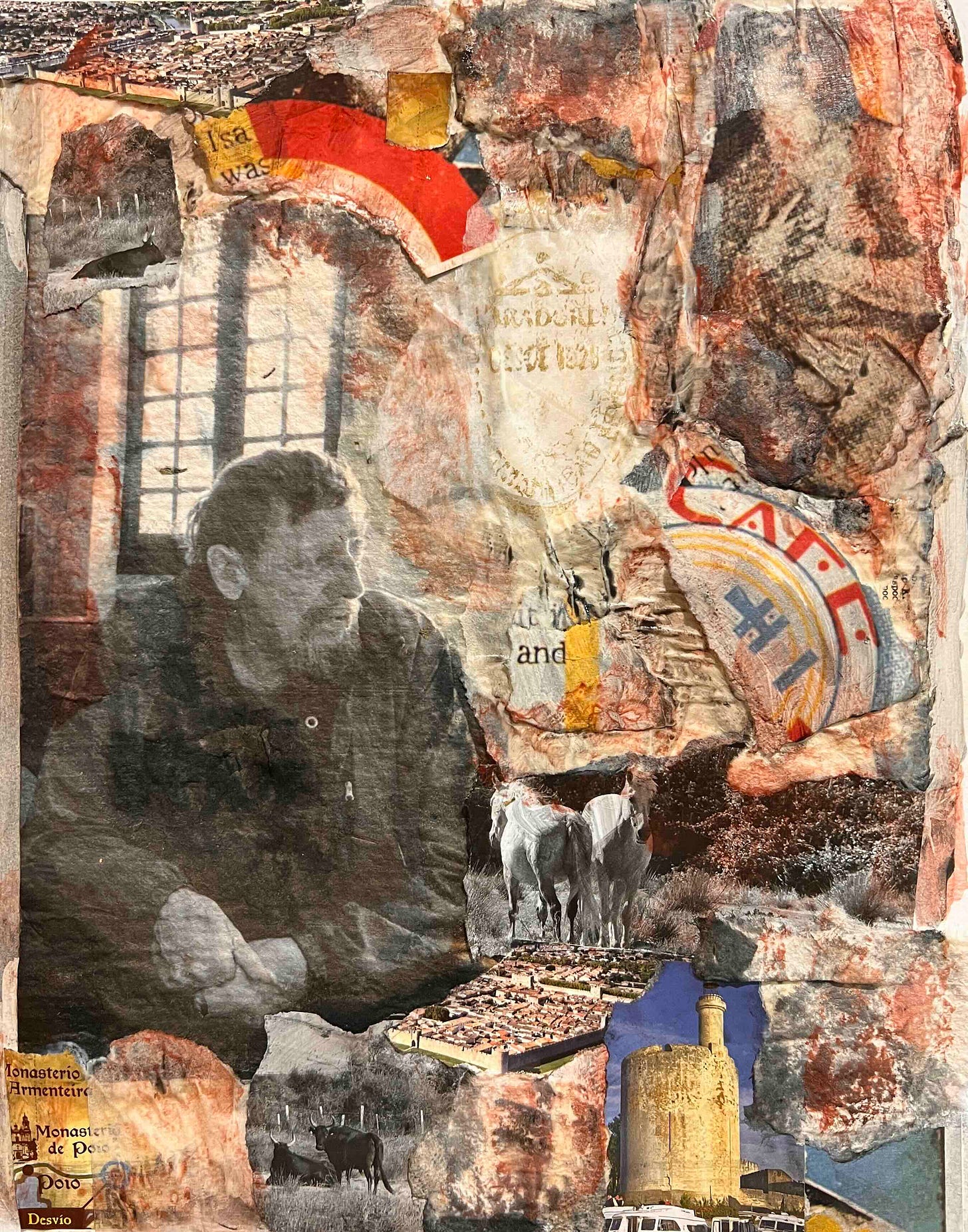 More collage/mixed media from me today. I started with a photo of Dad, converted it to B&W, and then printed it on a lovely piece of heavily textured handmade paper (thank you, Chris!!). Then I dug around in a bin of brochures, maps, and ephemera carefully saved from various trips with Dad and began to tear, cut, and then paste with wild abandon. After that, it was acrylic paint followed by a thin watercolour wash and… cohesive chaos? Sort of? I don’t quite have the knack of this yet. I took several books about collage techniques out of the library today and hope to have a few minutes to browse through them over the weekend.