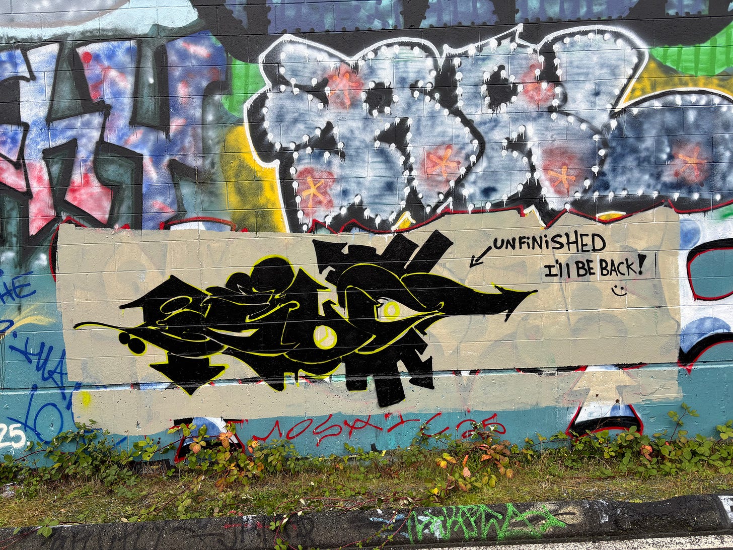 I agree that there are not enough hours in the day, and today was an odd one for me. Nothing I had planned worked out, and things that I had not planned took up a lot of my day. I dealt with my frustration by going for a long walk along the E&N Rail line, which is actually pretty inspiring, since you walk right by Trackside Art Gallery, Canada’s largest legal graffiti wall. Half a kilometre of huge paintings on the backs of warehouses. I’ll attach a couple below.