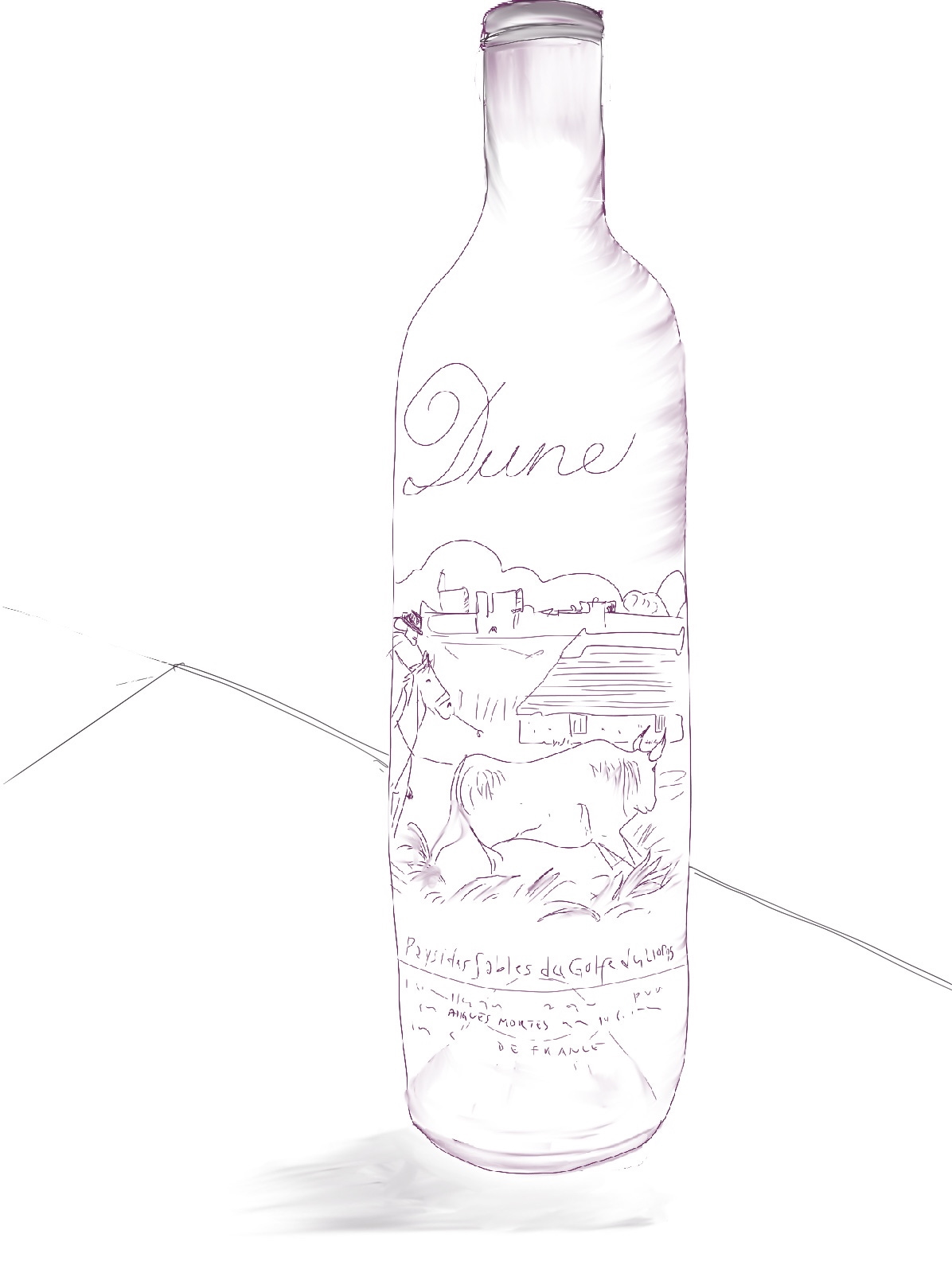 I was writing about this and remembered a wine bottle that Dad had carefully saved after he and I shared a simple meal (bread, cheese, tomatoes, cheap red wine) at the side of the road in the south of France. We had stopped at a farm-stand where they were selling local wine, cheese and olives and we borrowed their corkscrew in order to break into the bottle. We were both lightweight drinkers, so it took a few days to finish it, and when it was empty, Dad wrapped the bottle and brought it home, where it sat on a shelf in his studio until I snapped a photo of it many years later, after he passed away.