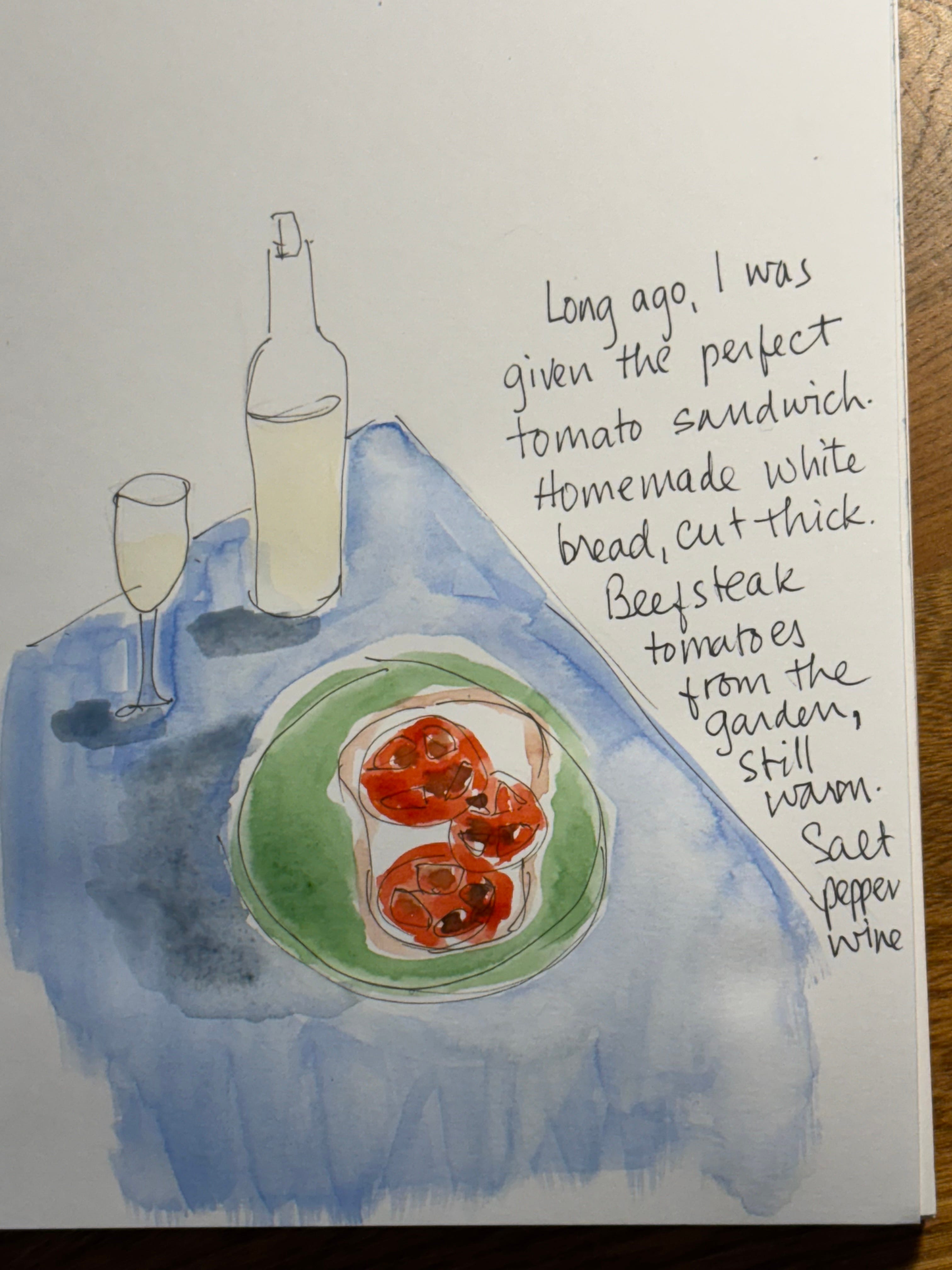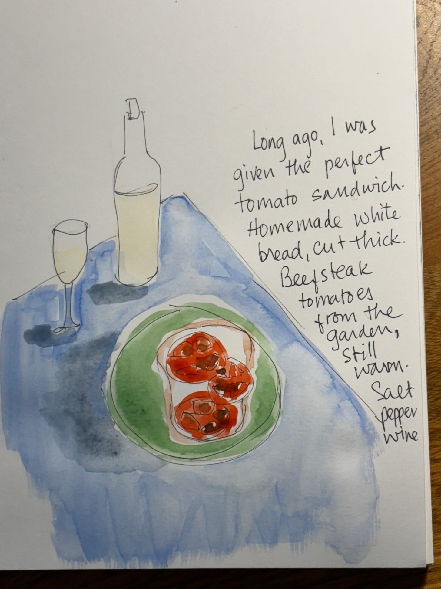 It sounds as if you had a wonderful rest day. I love the wine bottle drawing and the story about your dad. I agree that often what makes a meal memorable is the people we share it with. A meal that has stayed with me for over 50 years is pictured below. Drawn from memory. It was a glorious summer day and my boyfriend and I had been invited to lunch at the home of one of his co-workers, an older (he was probably 50 lol!) Italian mechanic who lived in a small house overlooking his huge garden. It was the only time I ever met him or his wife (not Italian). She had baked a wonderfully dense yet soft white bread, which she sliced thick and spread with a thin layer of her homemade basil pesto. He went out into the garden and came back with a couple of massive beefsteak tomatoes, which he sliced up and put on the bread and dusted with salt and fresh-ground pepper. We sat on the deck in the sunshine, eating tomatoes still warm from the sun, talking, laughing, and savouring the taste of summer. I think we must have left Victoria soon afterwards, to go and live on our boat. Perhaps that was why we never saw that lovely couple again. I have never tasted a better tomato.