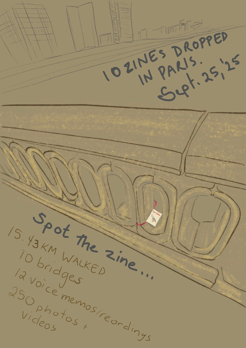 For each of the next ten bridges, I had to find a suitable place to leave a zine - somewhere that was visible to passersby, sheltered from rain and wind, and on (or close to) the bridge.