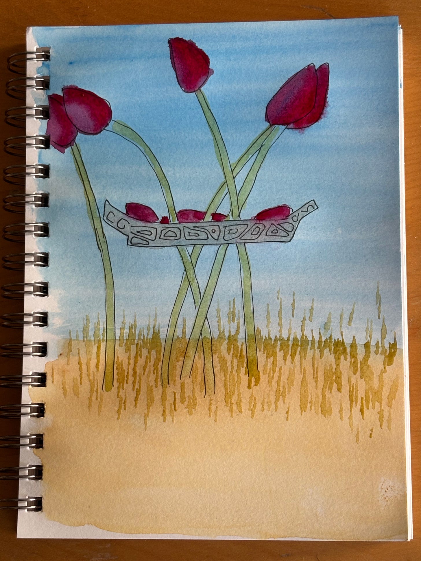 The Galerie is fantastique! As is your description of your zine dropoffs on bridges. I too walked over a bridge today, also muttering, also experiencing mood changes. I also did something I have not done in the 266 days we have been doing this drawing project: I ripped up two pages of drawings and threw them away. Here’s why. I parked my car on the Esquimalt side of the Johnson Street bridge, and walked around trying to find a good vantage point. It was windy and a bit cold as I balanced my sketchbook on a railing and took out my pen. That was when I made my first mistake: I tried to draw the entire span of the bridge. The old Blue Bridge was all angles; the new bridge is curvilinear and really complex. It’s quite lovely (after all the angst over replacing the Blue Bridge, I think most people like it) but it’s a b*tch to draw. For me, anyway. What I should have done was frame a section of the bridge and draw that. I made two attempts at the whole span—both complete failures. My mood darkened. My attention was caught by a repeated Indigenous motif on the walkway. I tried to draw it and messed that up, too. My mood darkened further, so I stopped drawing, walked across the bridge, bought some leggings, a London fog, a pencil, an eraser and a tube of Sap Green paint, and then walked back to the bridge. On the city side of the bridge is an art installation called Commerce Canoe. My mood had brightened slightly with the purchase of art supplies (and a sugary drink) so I drew the canoe and the reeds (they are not tulips, apparently). When I came home I ripped up the awful bridge drawings (trust me, they were bad) and added some colour to the canoe drawing.